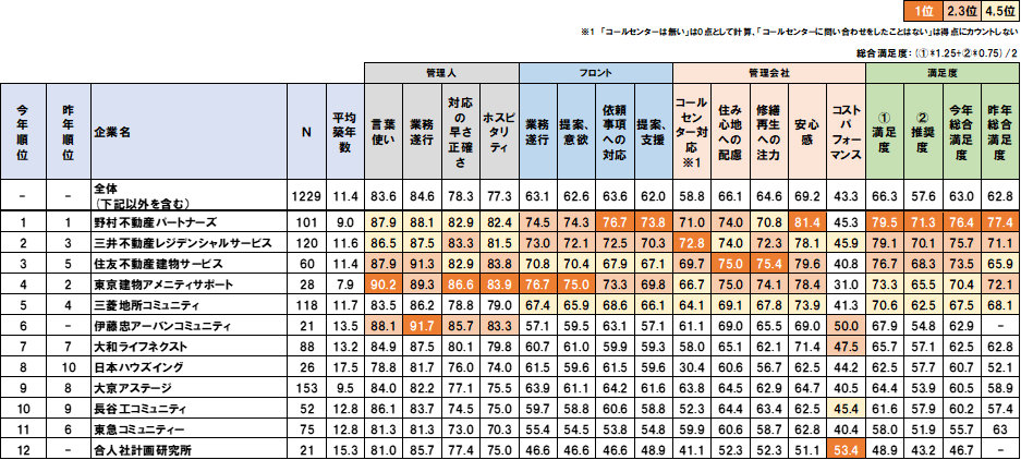 全体ランキングの総合満足度1位は、野村不動産パートナーズ(75.9ポイント、前年比+1.3ポイント)でした。次いで、三井不動産レジデンシャルサービス(74.9ポイント、同+0.9ポイント)、東京建物アメニティサポート(73.5ポイント同+2.8ポイント)という結果になりました。