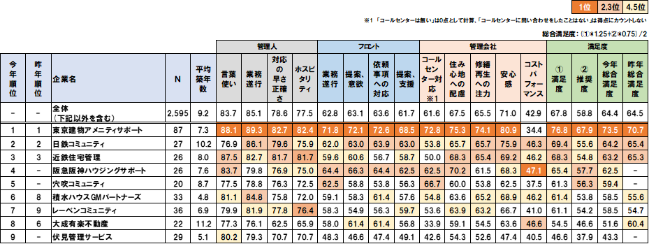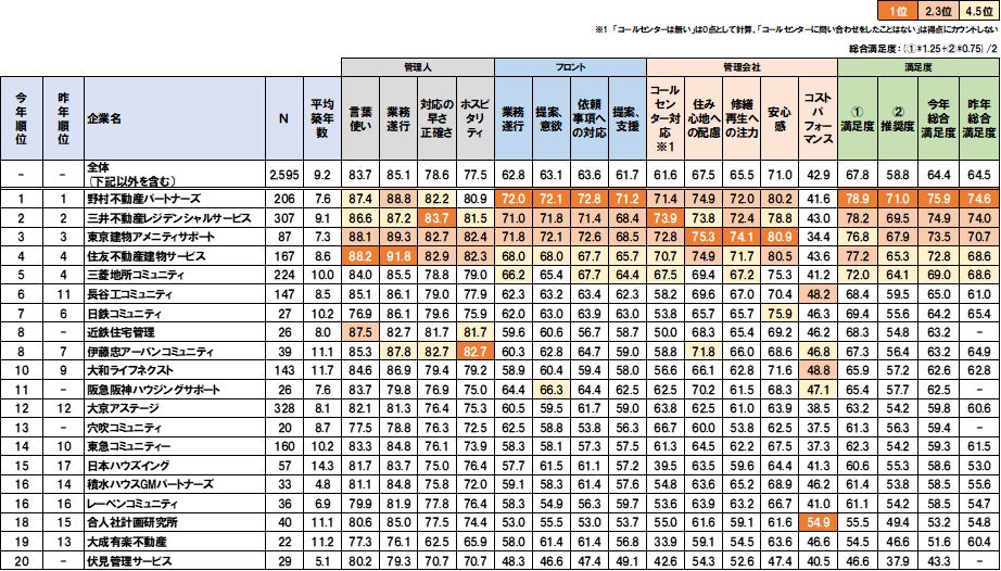 ■有効回答数:2,595(サンプル数20件以上の管理会社のみを公表しています)