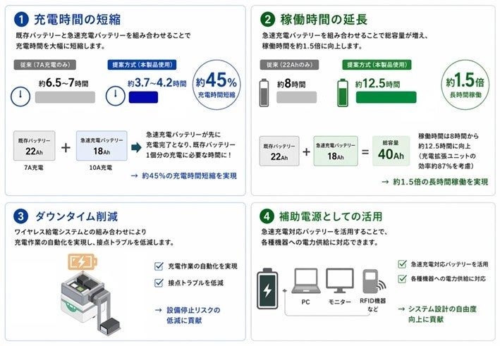 急速充電に対応したバッテリーを組み合わせることで、実質的なバッテリー容量の拡張と効率的な電力供給を実現し、稼働時間の延長と充電時間の短縮を同時に実現します。