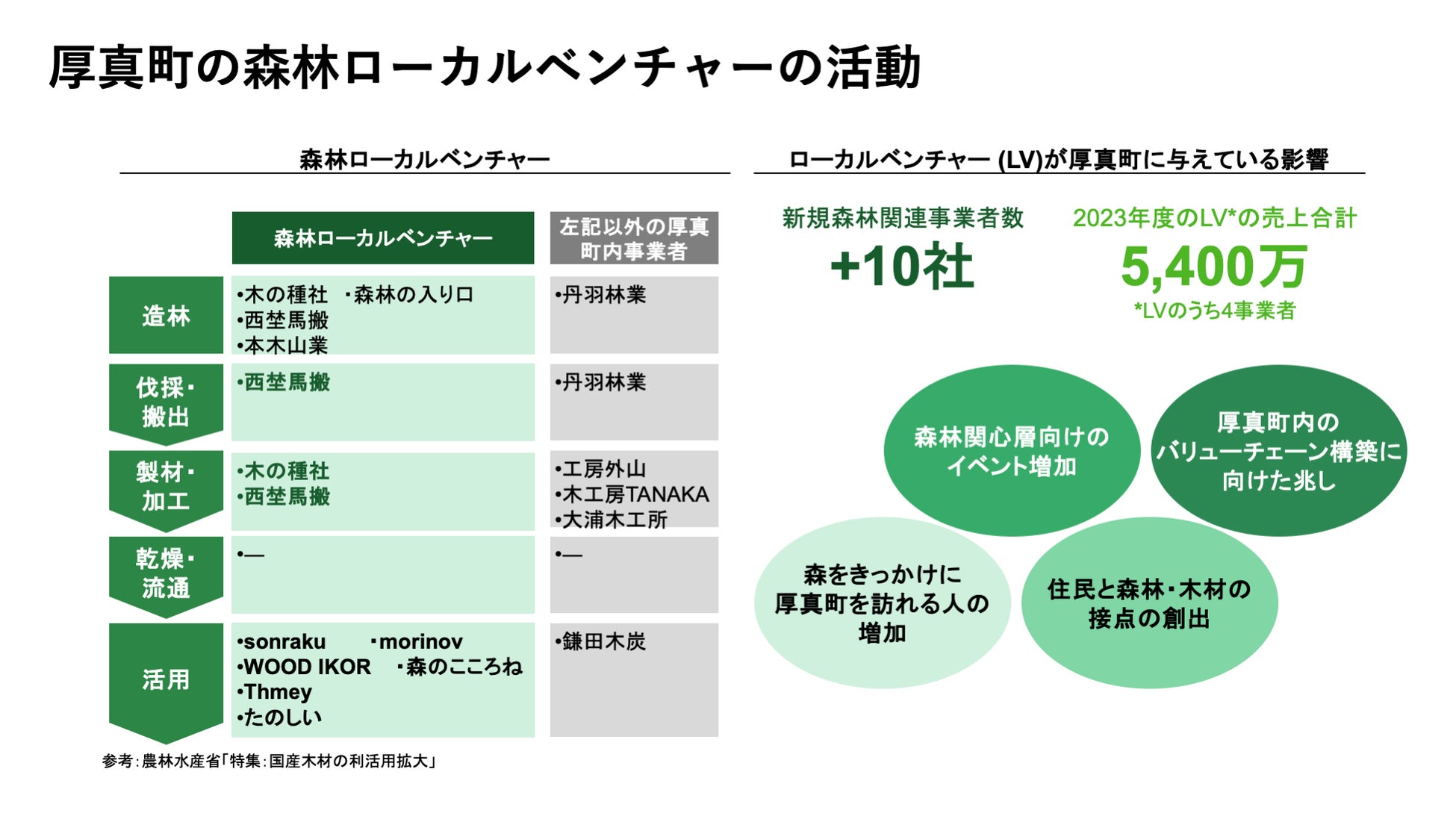 厚真町は2016年よりローカルベンチャー協議会に参画し、町独自の起業家育成プログラムなどを通じて町内にローカルベンチャー(地域資源を活用して起業したり新規事業に挑戦したりする人・団体)を創出する取り組みを続けてきました。町域の7割を森林が占めることもあり、これまでに誕生したローカルベンチャーによって町内の森林を資源として活用する事業が多く創出されています。2018年に発生した北海道胆振東部地震の土砂崩れにより町内の森林の約11%にあたる3,160ヘクタール(東京ドーム約670個分)が崩壊しました。しかし、町は2次災害に備えながら、森林の再生と路網の復旧を進め、地震前から取り組んできた森林の活用に改めて取り組んでいます。実績として、2016年からこれまで新たに10社の森林関連事業者(「森林ローカルベンチャー」と呼びます)が誕生しました。その経済効果は年間5,400万円に上ります。さらに、町内の産業連関や住民の意識変化、交流人口増加などの波及的効果も観察されています。環境保全林の活用にあたっても、林業にとどまらない森林の価値を引き出すことが必要と考えられ、森林ローカルベンチャーが中心的な役割を担うことが期待されています。
