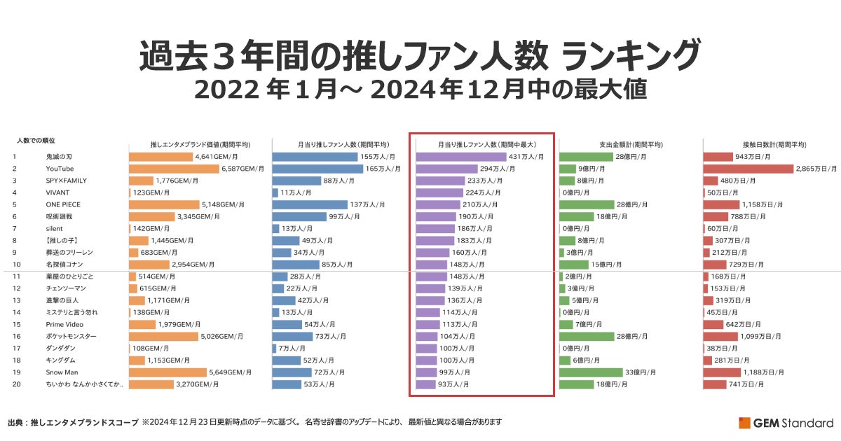 3年間で「推しファン人数」の最大値を記録したのは『鬼滅の刃』、アニメ関連エンタメブランドがTOP20の半数以上を占める