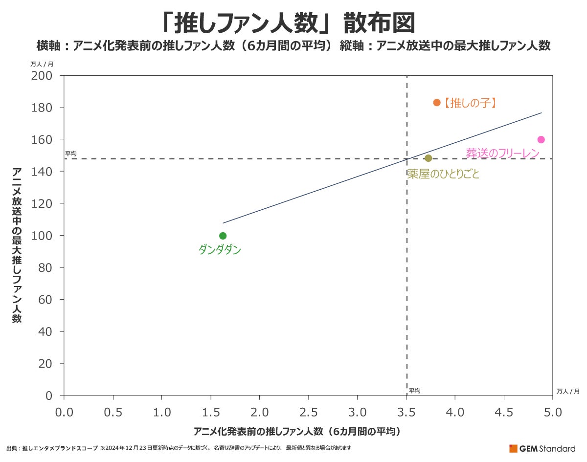 青の傾向線が示す通り、アニメ化発表前の平均「推しファン人数」と、放送中の最大「推しファン人数」には連動した傾向がみられます。『葬送のフリーレン』『薬屋のひとりごと』『ダンダダン』の3作品は、アニメ化前の推しファンの"期待"に応えた盛り上がりをみせたといえます。