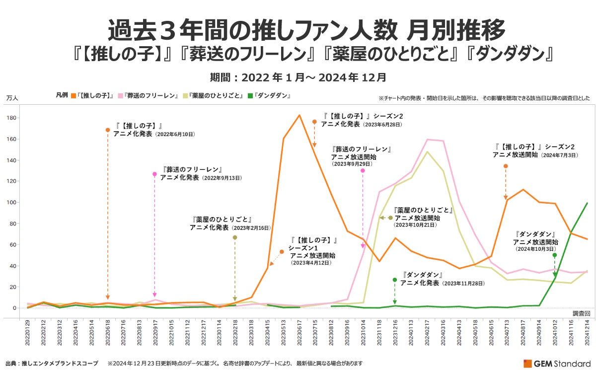 『【推しの子】』『葬送のフリーレン』『薬屋のひとりごと』『ダンダダン』、アニメ化前の推しファン人数からヒットポテンシャルを探る【GEM Partners】