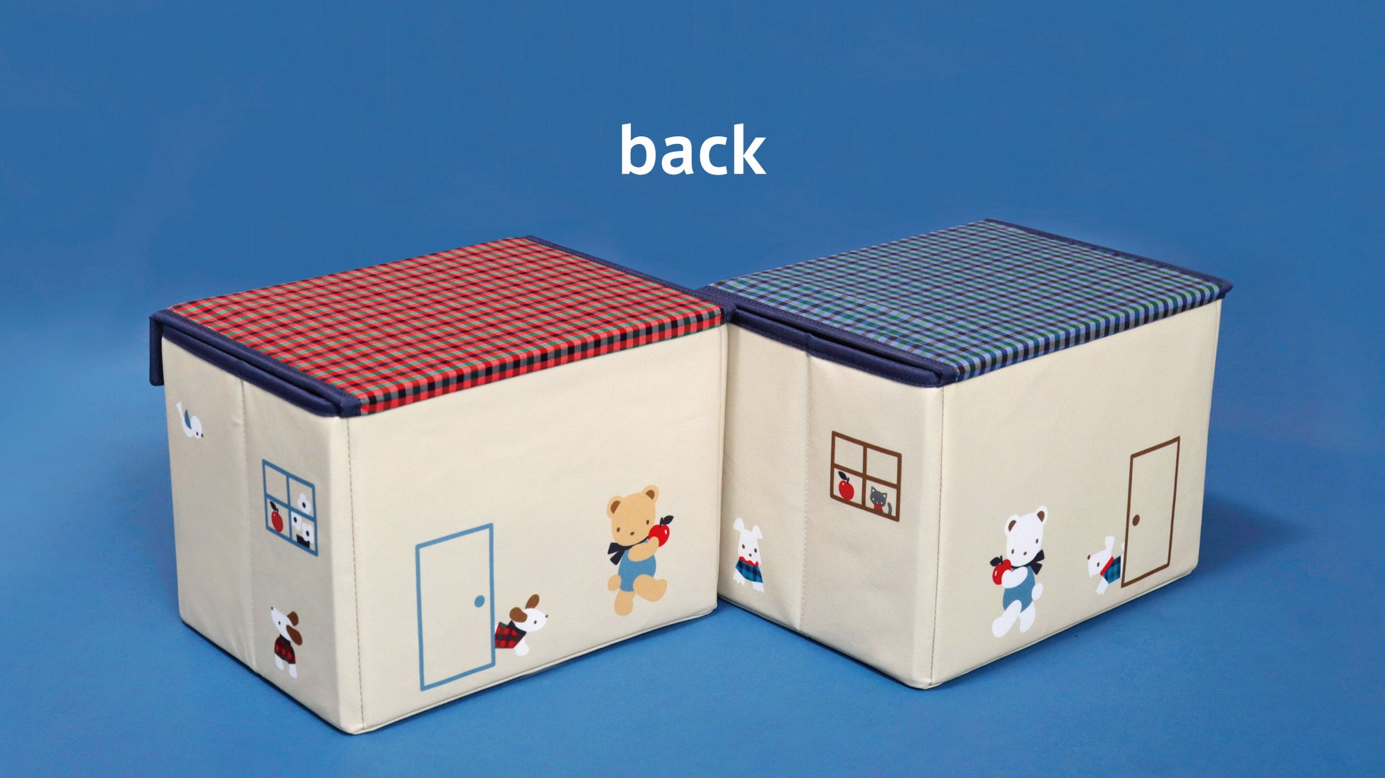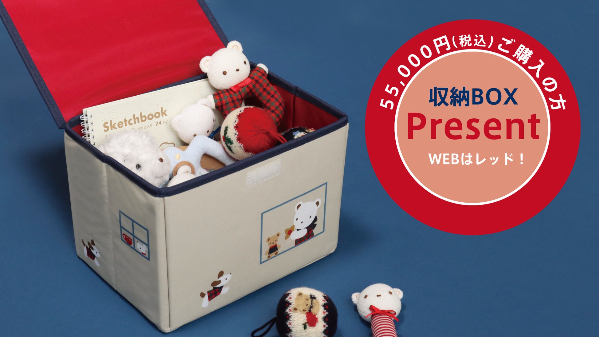 期間中、対象金額以上お買い上げの方におうちをイメージした、WEB ver. と店舗 ver. それぞれのアートの収納ボックスをプレゼント!ワンちゃんが、クマちゃんのおうちに遊びにでかける様子が 描かれています。バッグ(780681)とリンクしたクマちゃんが登場しているのもポイント。シャンブレー調のファミリアチェックの蓋を屋根に見立てて、お片付けが楽しくなるデザインに仕上げまし た。WEB ver.と店舗 ver.それぞれの柄を2つ揃えて、ストーリーをお楽しみください!