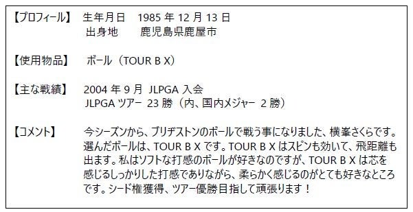 ブリヂストンスポーツ株式会社は、国内女子ツアー通算23勝を挙げ、2009年、「国内女子ツアー賞金王」および「LPGA最優秀選手賞」受賞、2013年、「LPGAメルセデス・ランキング1位」など、数々のタイトルを獲得した『横峯さくら』とゴルフボール使用に関する契約を締結しました。
