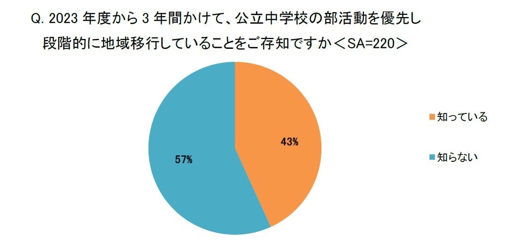 2023年度より、少子化による生徒数の減少や指導にあたる教員の負担軽減などを背景に、全国の公立中学校を皮切りに、部活動を地域の文化・スポーツ団体の活動に移行していく「地域移行」が進んでいます。そのような中、子どもを持つ親に「2023年度から3年間かけて、公立中学校の部活動を優先して段階的に地域移行していることを知っていますか<SA>」と尋ねたところ、「知っている」(95)と回答したのは約4割に留まりました。