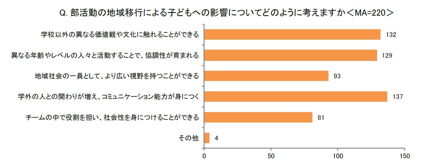 そして、「部活動の地域移行による子どもへの影響についてどのように考えますか<MA>」との問では、「学外の人との関わりが増え、コミュニケーション能力が身につく」(137)、「学校以外の異なる価値観や文化に触れることができる」(132)、「異なる年齢やレベルの人々と活動することで、協調性が育まれる」(129)の回答が上位にあがり、いずれも約6割となりました。