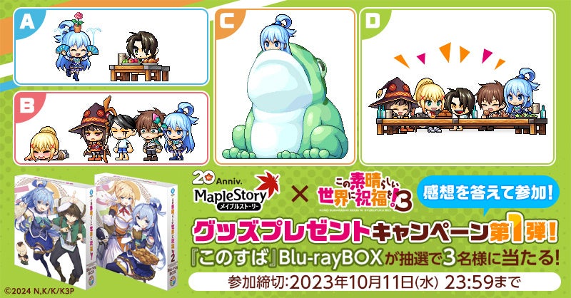 『メイプルストーリー』と『この素晴らしい世界に祝福を!』とのコラボを記念して、『このすば』グッズが当たるプレゼントキャンペーンを開催いたします。第1弾は、「メイプル×このすばコラボ記念「お気に入りの椅子はこれっぷる!」キャンペーン」と題し、ご参加いただいた方の中から抽選で、『この素晴らしい世界に祝福を!』アニメ第一期・第二期のBlu-rayBOXをプレゼントいたします。4つのコラボ椅子の中から、お気に入りを選んでX(Twitter)に投稿し、ご参加ください!