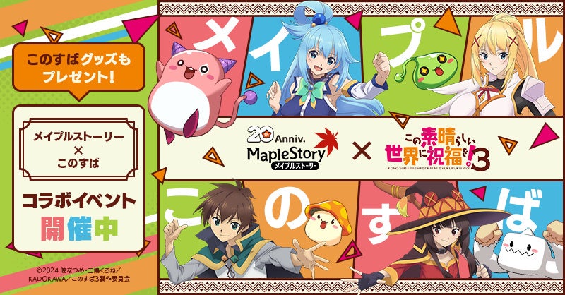 バーチャルワールドの制作及び運用を行う株式会社ネクソン(本社:東京都港区、代表取締役社長:Owen Mahoney/オーウェン・マホニー、東証:3659、以下 ネクソン)は、PC向けにサービス提供中のアクションオンラインゲーム『メイプルストーリー』において、2023年10月4日(水)より、TVアニメ『この素晴らしい世界に祝福を!3』とのコラボイベントを開始いたしました。