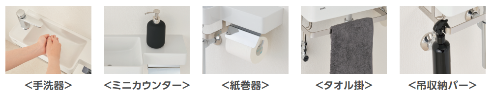1台の手洗器の中に手洗器・ミニカウンター・紙巻器・タオル掛・吊収納バーという5つの役割を集約してコンパクトにまとめました。