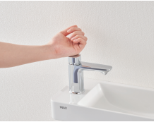 指や手のひらで握らずにプッシュ操作で使用できる「プッシュ水栓」を採用しました。器具への接触も最低限で衛生的です。