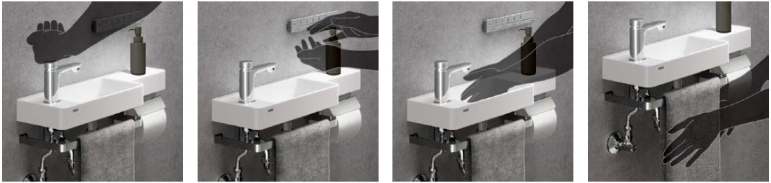 従来は、手洗器・紙巻器・タオル掛などそれぞれを手配し、複数か所の位置決めや壁補強が必要でしたが、「オールインワン手洗」は5つの役割を1つに集約しているため、1品番で手配が完了し、施工箇所も1か所で済むので、プロユーザーの手間を省くことができます。