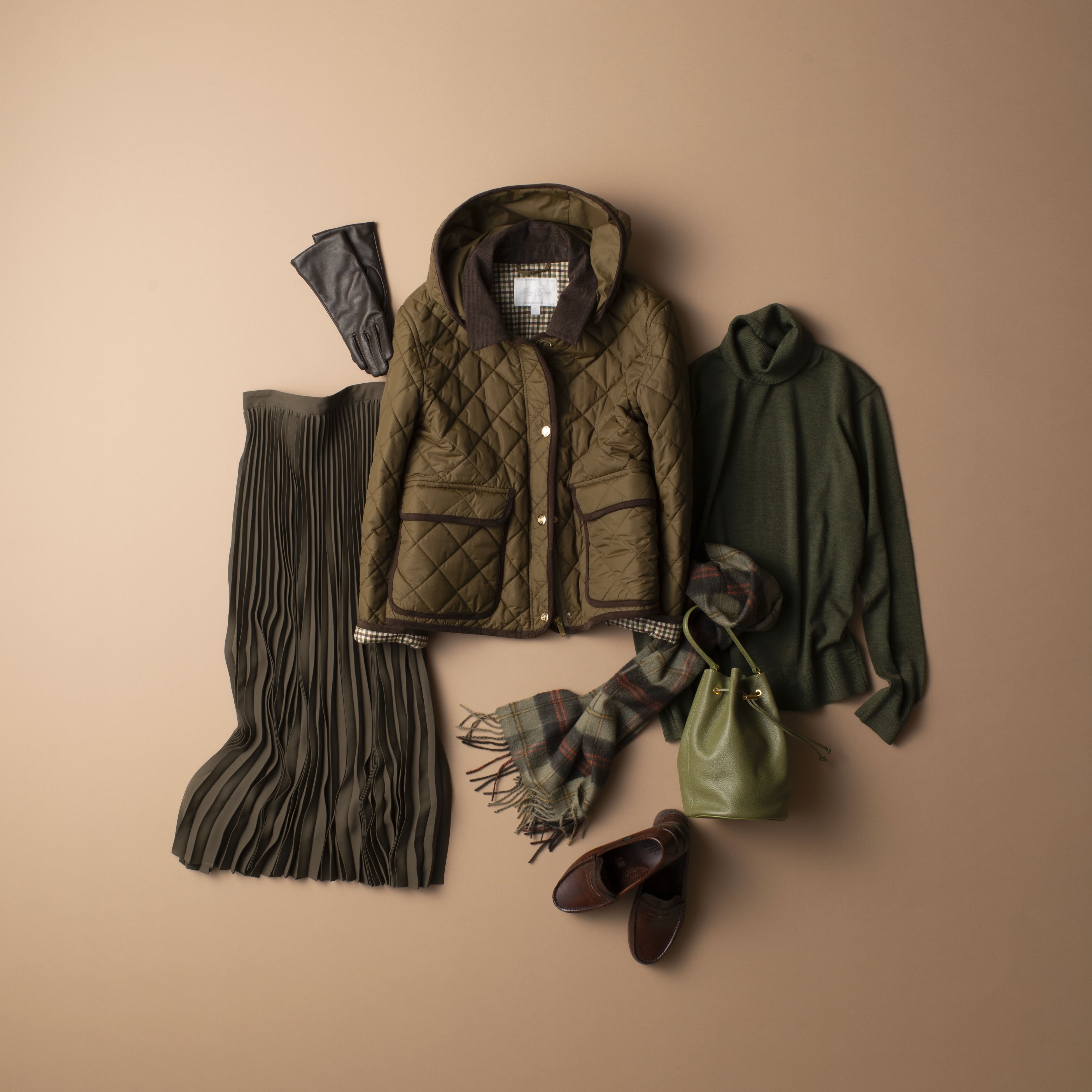 「キルティングジャケットって、マスキュリンな印象のアイテムですよね。しかも、ずっと昔からあるからどこか見慣れてしまっていて、ありきたりに思われがち。私自身も、最初はそう感じていました。でも、それをあえてスカートや女性らしい素材と組み合わせると、グッと新鮮で面白くなるんです。今回はその視点から、このジャケットを選びました」