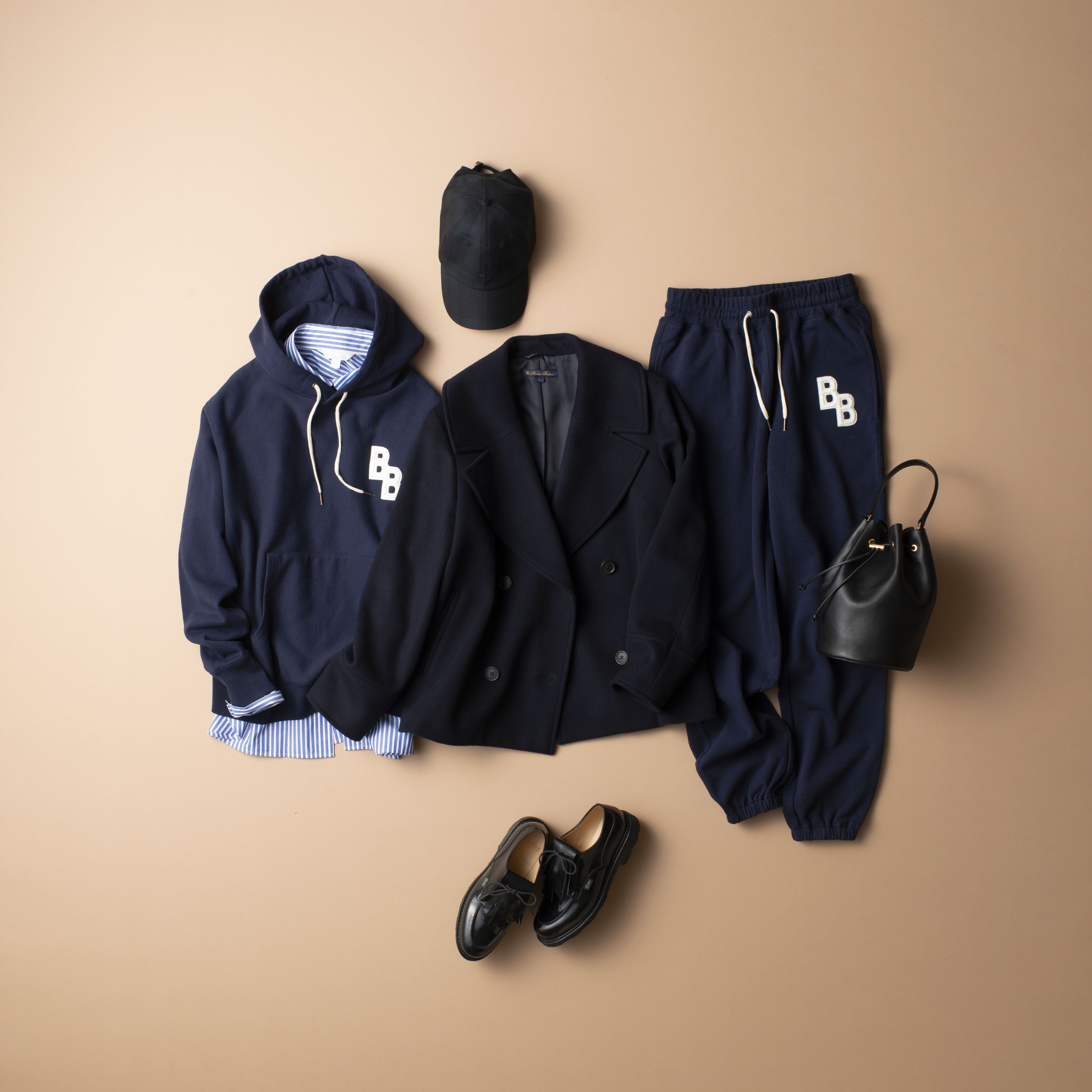 「スポーティーなスウェット上下は“ご近所着”に見えがち。けれどピーコートを羽織れば、途端に外出仕様へと格上げされます。クラシックなアイテムには、カジュアルを洗練へ導く力があるからです。“ひそかな柄合わせ”も大切なポイント。ブラックウォッチのキャップにストライプシャツを重ねれば、心地よいリズムが生まれる。クラシックに軽さを添えれば、大人にふさわしいピーコートスタイルが完成します」