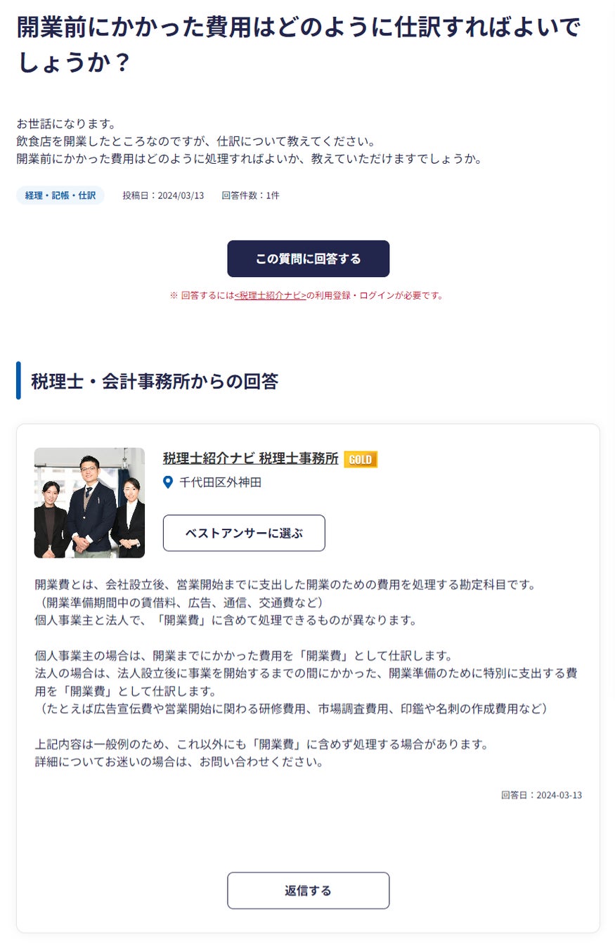 仕訳や決算関連など、日々の業務で抱えるさまざまな質問を、簡単に投稿することができます。質問は匿名で、何度でも投稿することが可能です。また、受け取った回答のうち最も役に立ったと感じた回答を「ベストアンサー」に指定することができます。サービスの利用にあたり、会員登録などは必要なく、無料で利用が可能です。