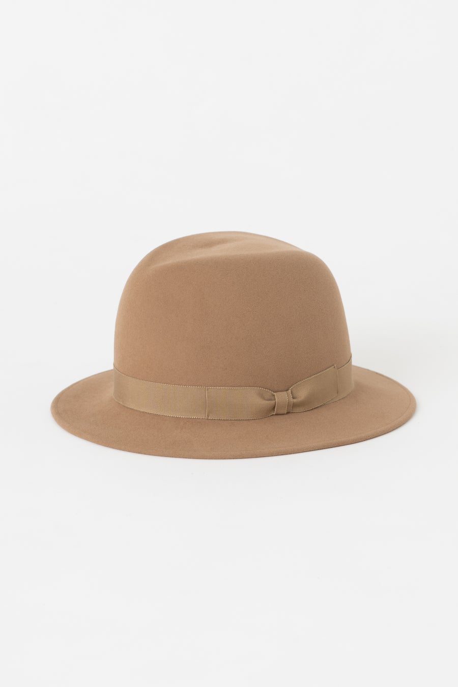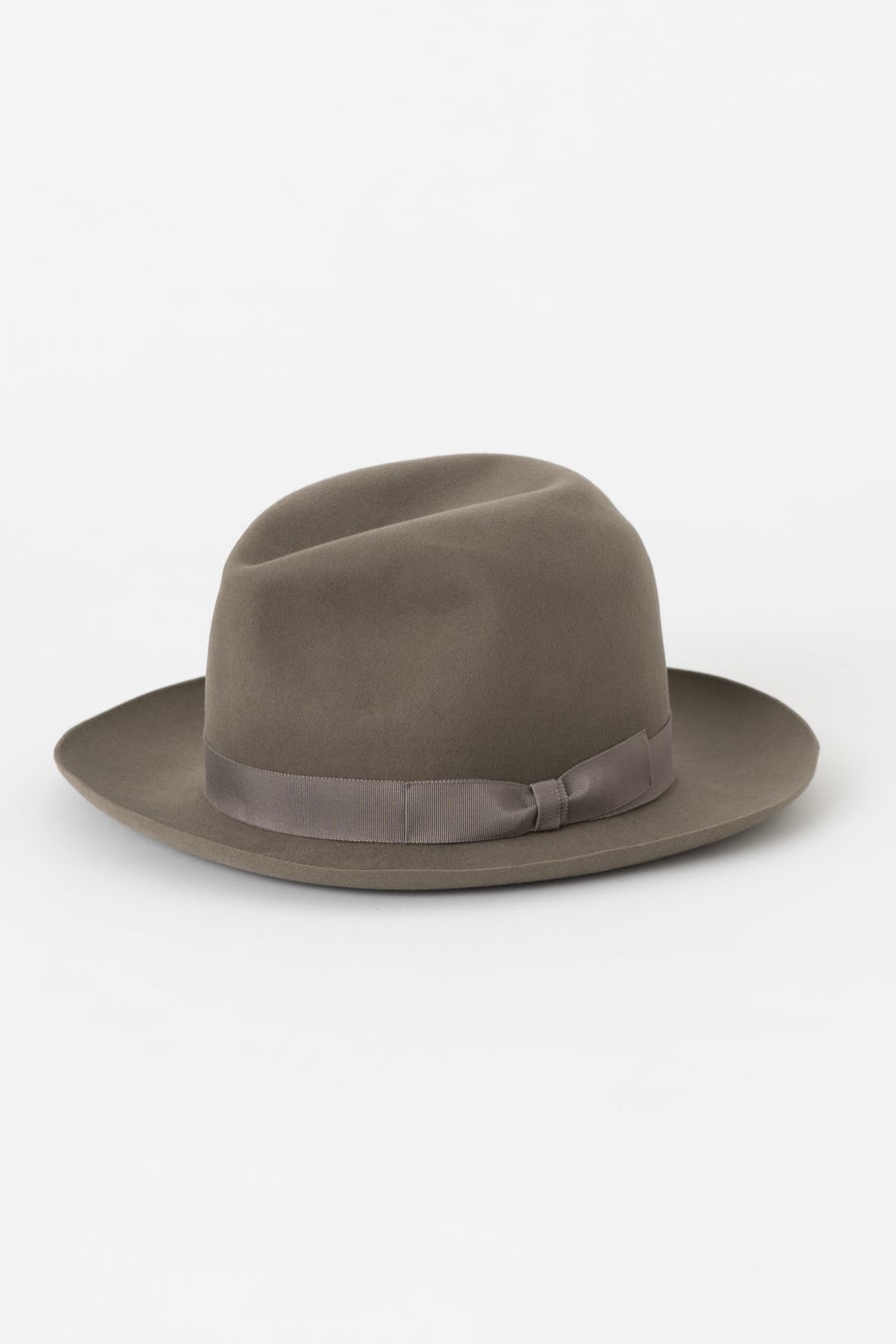 クラシックなセンタークリースのフォルムに、高密度でハリのある生地を用いることで、美しいシルエットを保ちながら型崩れしにくいのが特徴。そのシンプルな佇まいから、和装にも合わせやすいハットとしてご提案しています。