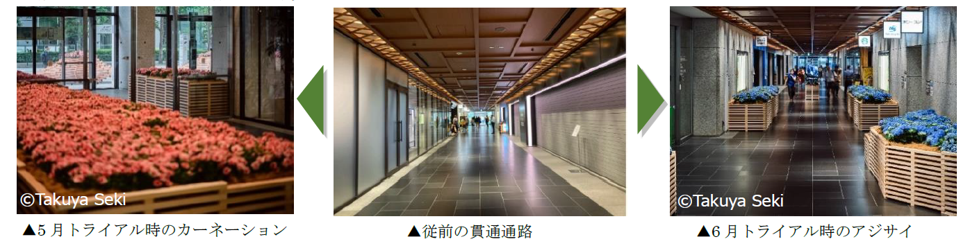 本リニューアルでは、“まちに季節を、ビルの中に季節を。”をコンセプトに、月替わりで1F通路空間と外構部を季節の植物で彩ります。花壇と同じ木材で設えたベンチも併設しており、来街者には驚きを、エリアワーカーには癒しを感じてもらえる憩い空間としてリニューアルしました。トライアル期間の5月には5万本のカーネーション、6月には600鉢のアジサイの設置を経て、本格始動となる7月からは七夕にちなんで笹竹を、8月は夏にふさわしい設えを予定しております。