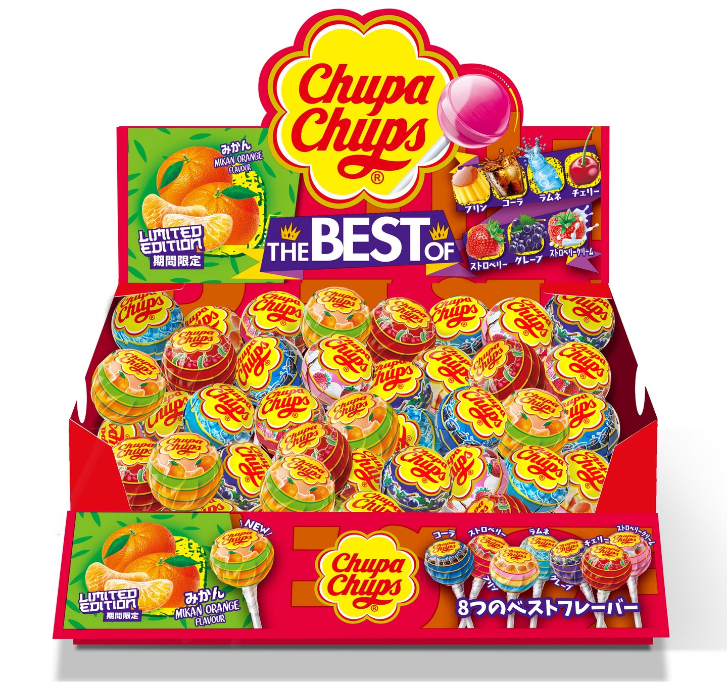 発売以来、世界中で愛されるロリポップキャンディ「チュッパチャプス」の人気 フレーバー7種類に、期間限定フレーバー「みかん」が追加されました。その時の気分に合わせて、好きな味のキャンディを選び、その味を楽しむことができる商品となっています。