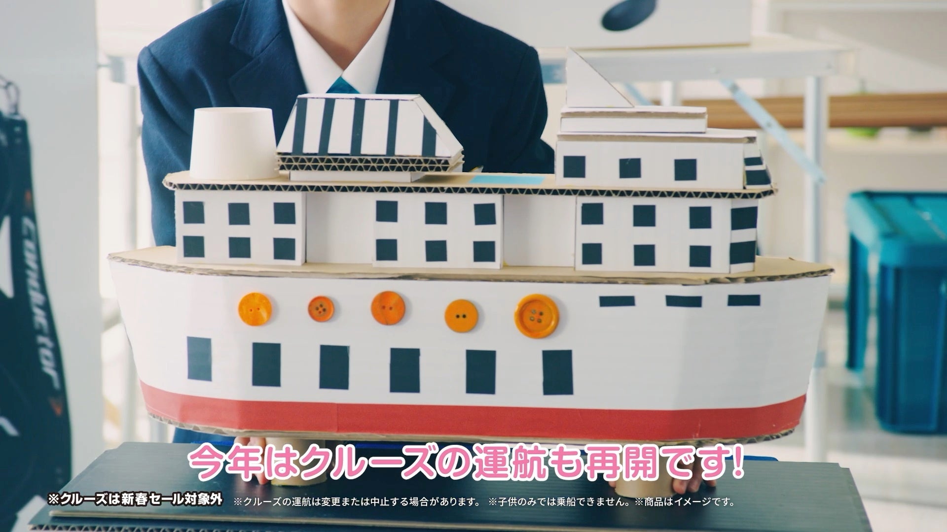 「完コピ版」では、「通常版」とは異なり、全編こどもMCが主演を務めます。キャンペーンタイトルや、クルーズ船は段ボール紙で作られ手作り感たっぷり。クレジットカードはクレヨンで書かれた“紙”で代用。自作アイテムを使い、一生懸命にMCになりきって説明するこどもMCの姿に思わず顔がほころぶ、新年にほっこりできるCMとなっております。