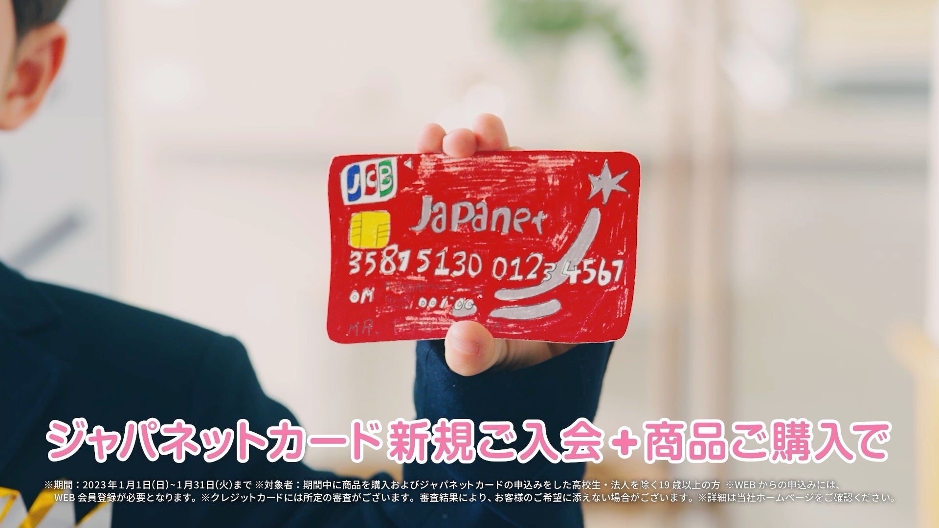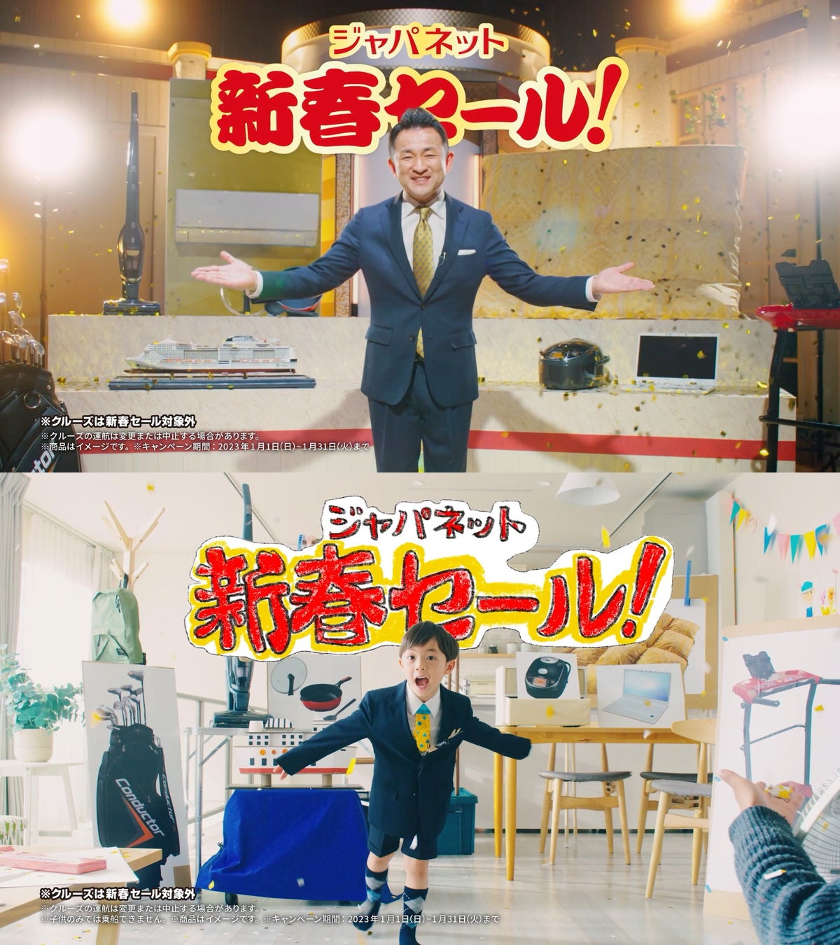 新年のスタートに、元気とワクワクをお届けしたいという想いでCMを制作いたしました。初売りならではの商品を限定特価で販売し、クルーズ旅行の販売再開を伝えます。新年に、気持ちも新たにスタートを楽しんでいただける家電・生活用品のラインナップや、新たな出会いにワクワクできるようなクルーズ旅行の新コースもご用意。それらを弊社のMCがご紹介していると、途中からこどもMCがカットイン…。ジャパネットカード新規入会キャンペーンを本物も顔負けのトークでご説明します。