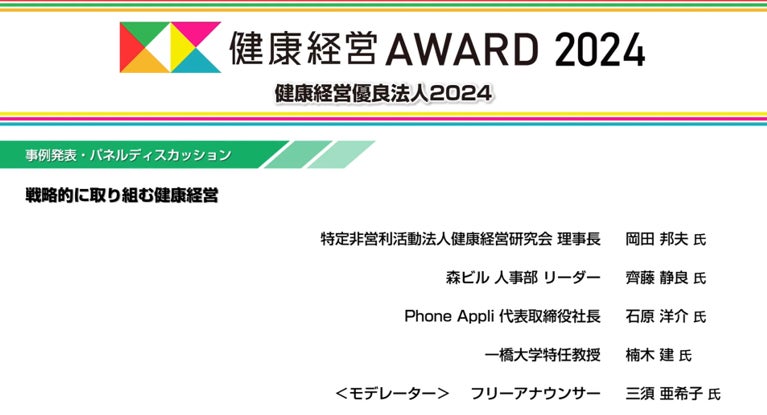すべての企業をウェルビーイング企業にアップグレードすることを目指す、株式会社PHONE APPLI(本社:東京都港区、代表取締役社長:石原 洋介)は、経済産業省主催の「健康経営アワード2024」(3月13日開催)で行われた「戦略的に取り組む健康経営」と題したパネルディスカッションにおいて、当社代表の石原洋介が登壇したことをお知らせします。本アワードは、「健康経営優良法人2024」および「健康経営銘柄2024」に選ばれた企業を称えるため、経産省が主催しています。
