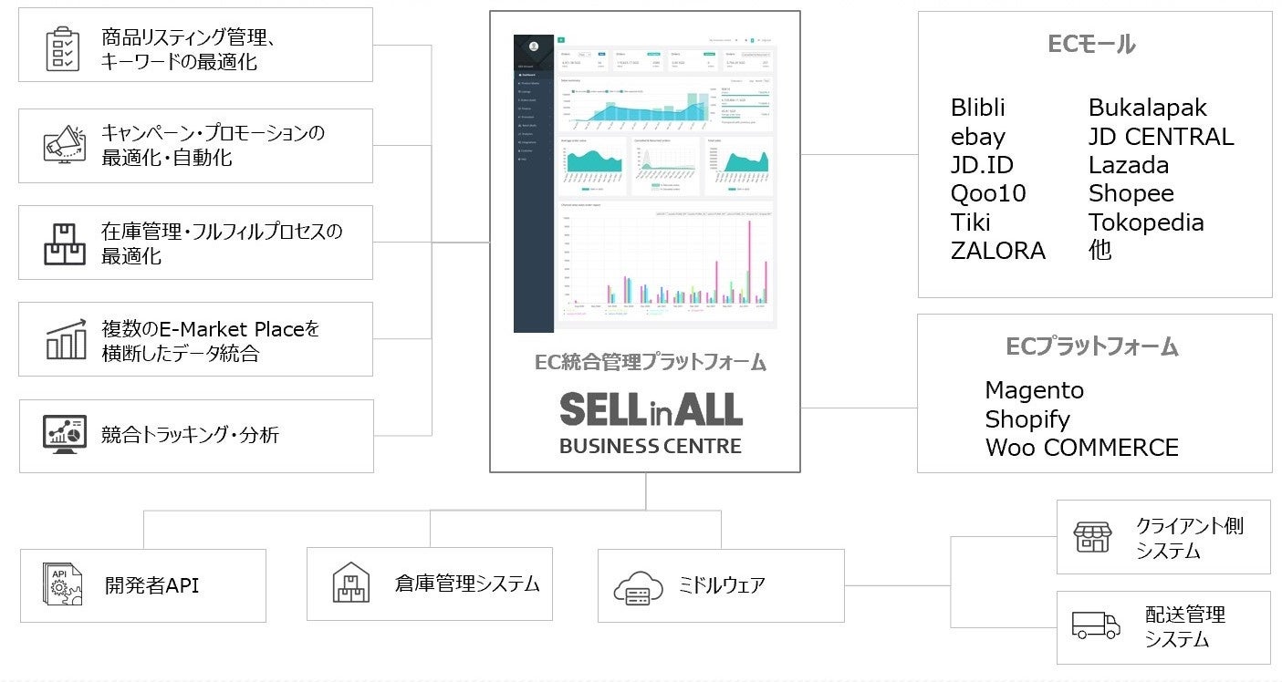 受注管理、商品リスト作成/最適化、在庫/倉庫管理、モール内広告/キャンペーン管理、統合ペイメント等