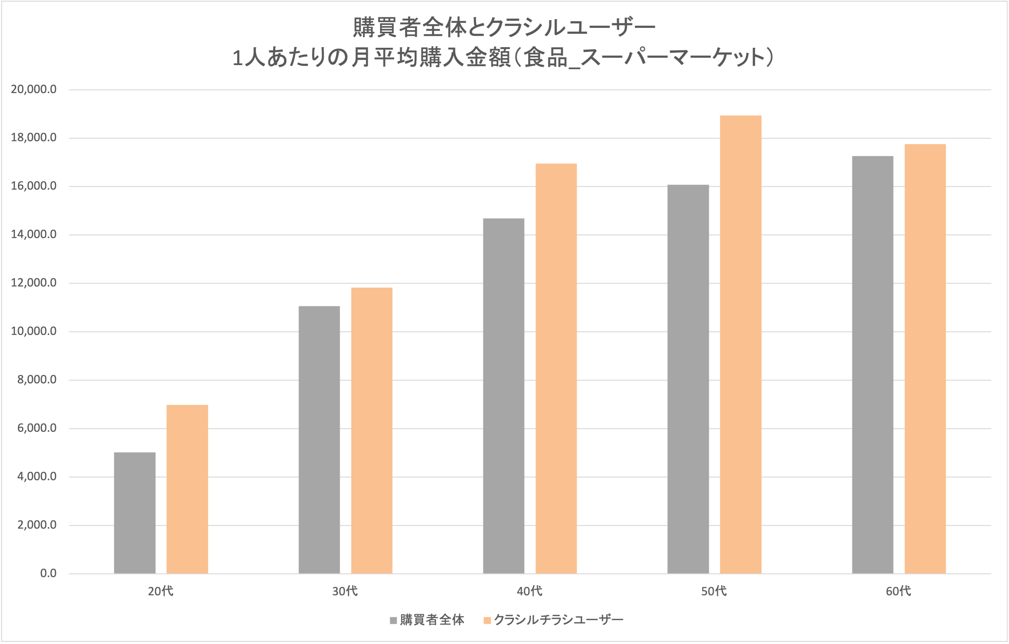 ・「クラシルチラシ」ユーザーは月平均食品購買金額が20代、40代、50代で一般消費者に比べて約2,000円以上大きい。30代、60代では500〜700円と、全年代で食品購買金額が大きい