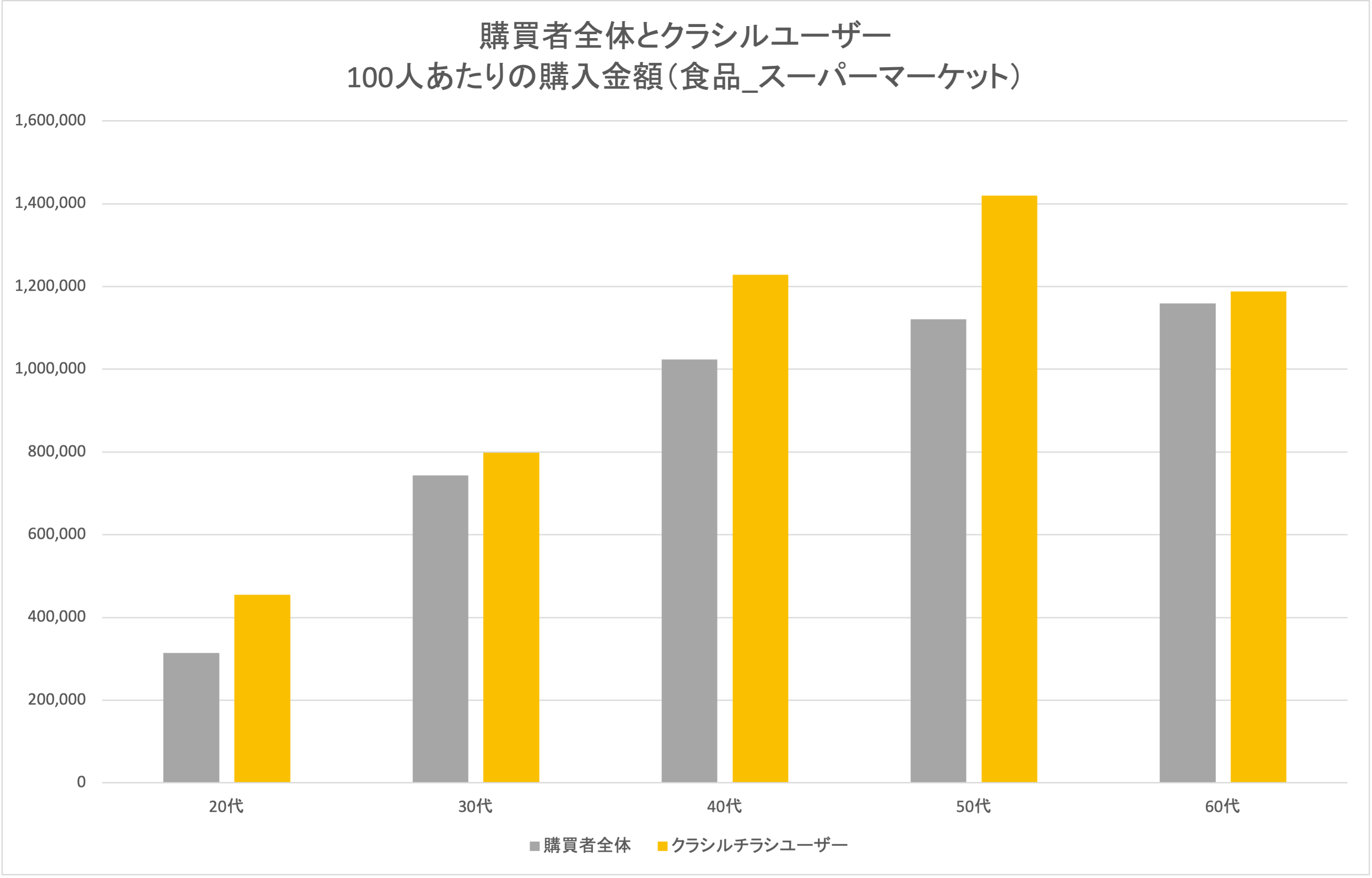 ・100人あたり購買金額は特に「クラシルチラシ」ユーザーの20代、40代、50代で高くなっており、購買者全体と比較すると10万円以上の差が出ている