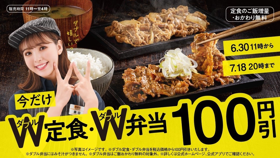 株式会社吉野家(本社:東京都中央区、代表取締役社長 河村泰貴、以下吉野家)は、6月30日(金)11時から7月18日(火)20時までの期間、全国の吉野家店舗※で「W(ダブル)定食」と「W(ダブル)弁当」を税込価格から100円引きで提供するキャンペーンを実施します。 ※一部店舗では実施していません。