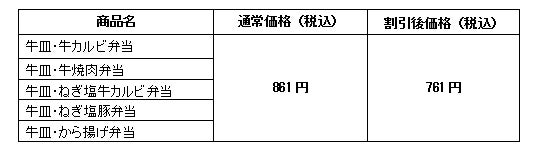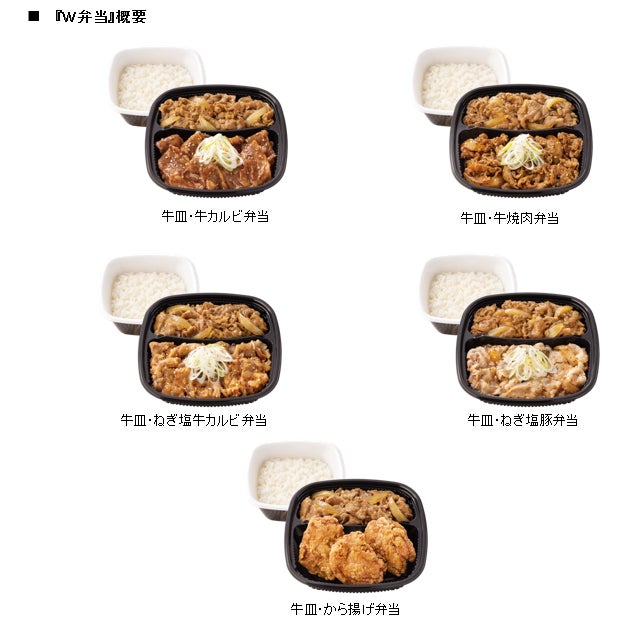 テイクアウト限定商品の『W弁当』は「牛皿・牛焼肉」「牛皿・牛カルビ」「牛皿・ねぎ塩牛カルビ」「牛皿・ねぎ塩豚」、「牛皿・から揚げ※」の5種類です。ご飯増量は無料です。キャンペーン期間中は通常価格798円(税込861円)から100円引きした税込761円でお求めいただけます。