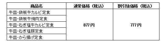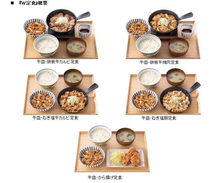店内で楽しめる『W定食』は「牛皿・鉄板牛カルビ」「牛皿・鉄板牛焼肉」「牛皿・ねぎ塩牛カルビ」「牛皿・ねぎ塩豚」「牛皿・から揚げ※」の5種類です。キャンペーン期間中は通常価格798円(税込877円)から100円引きした税込777円でお求めいただけます。テイクアウトはできません。