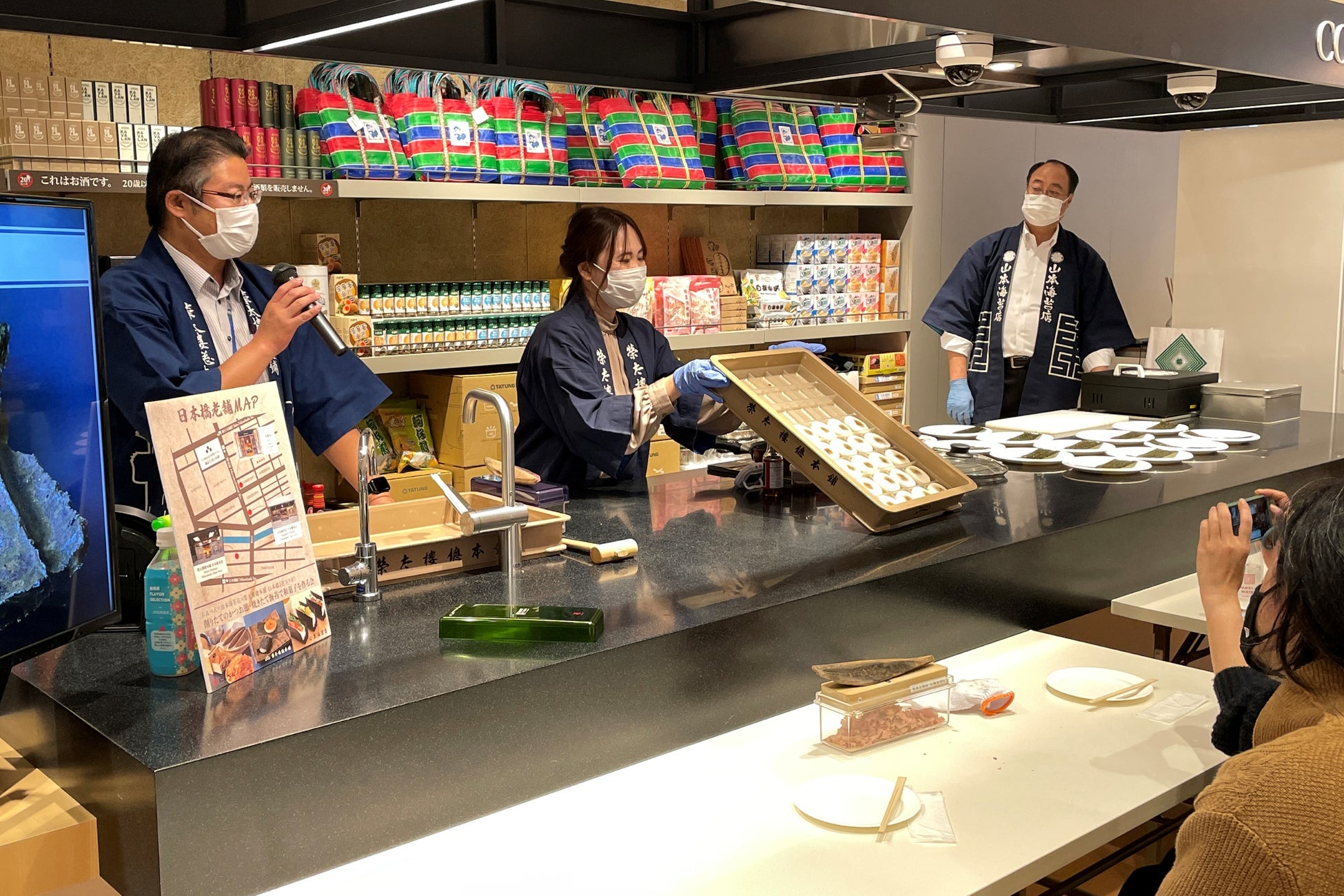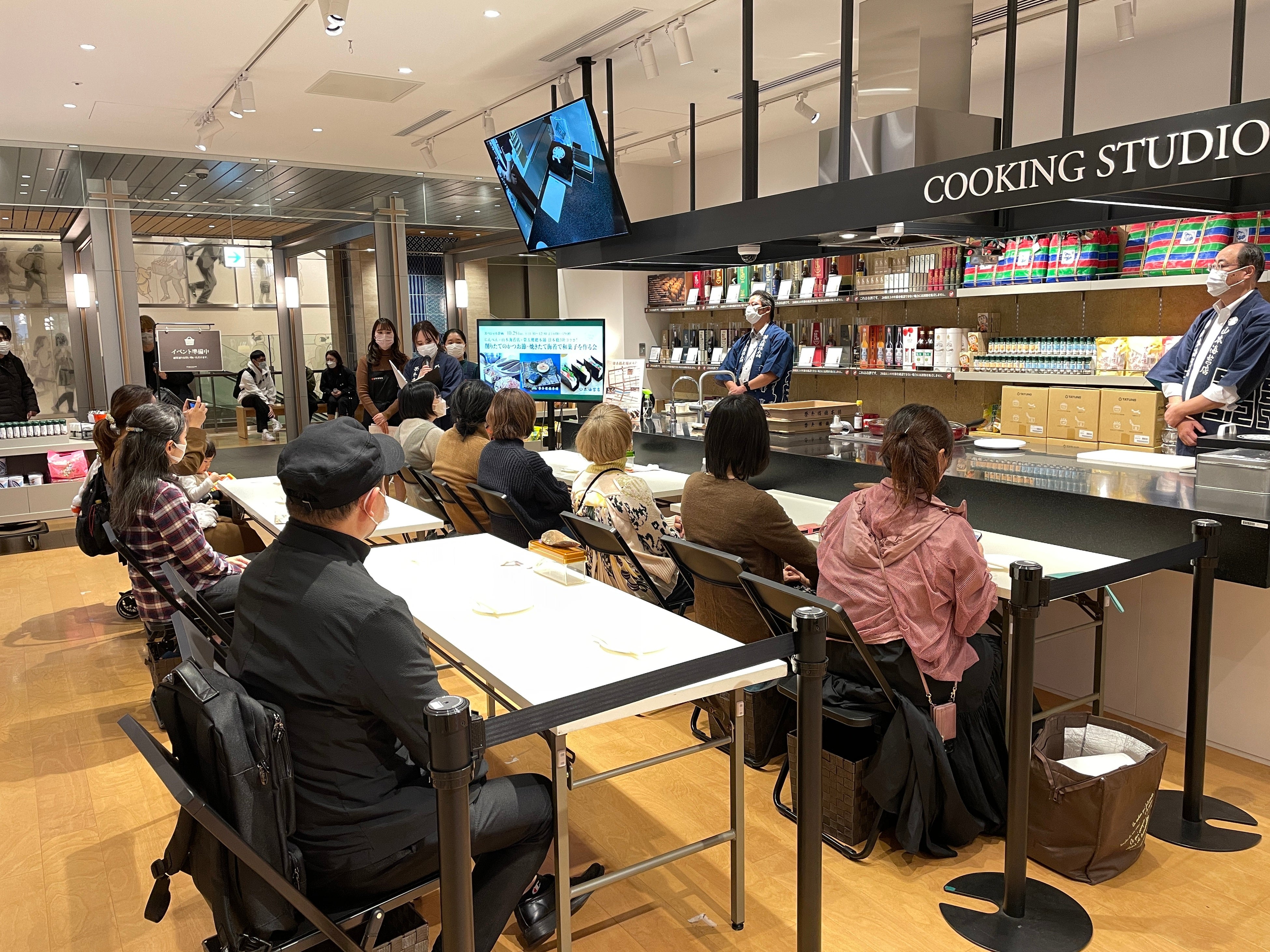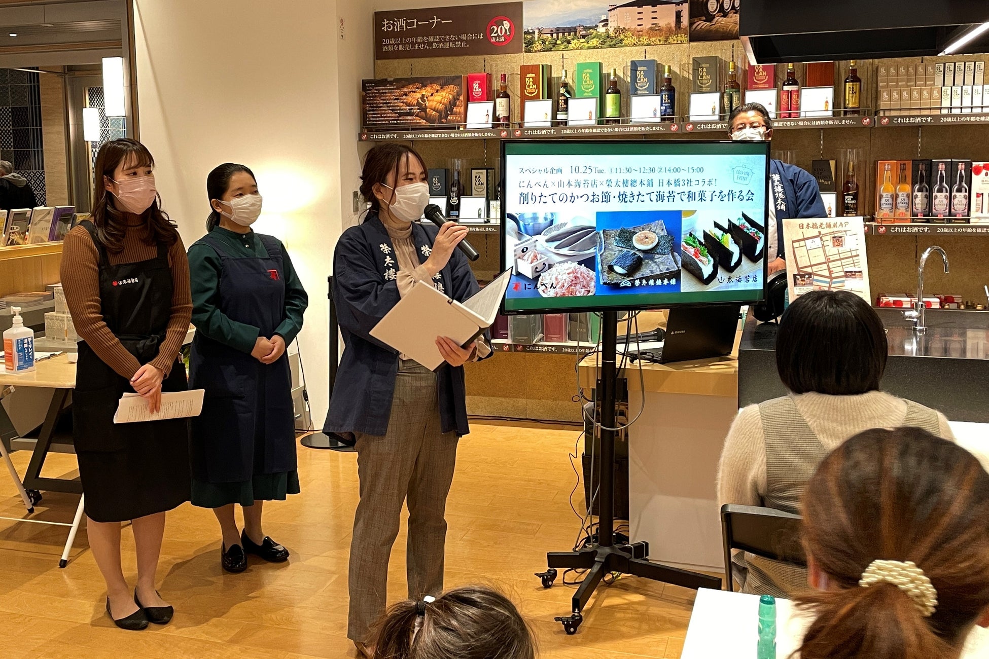 株式会社にんべん(東京都中央区、代表取締役社長 髙津伊兵衛)は、誠品生活日本橋の周年祭企画として、株式会社榮太樓總本鋪(東京都中央区、代表取締役社長 細田眞)、株式会社山本海苔店(東京都中央区、代表取締役社長 山本貴大)と共同で、3社のこだわり素材を使用した焼きたての「日本橋餅」をその場で味わっていただく体験イベント「削りたてのかつお節・焼きたて海苔で和菓子を作る会」を、2022年10月25日(火)に実施いたしました。