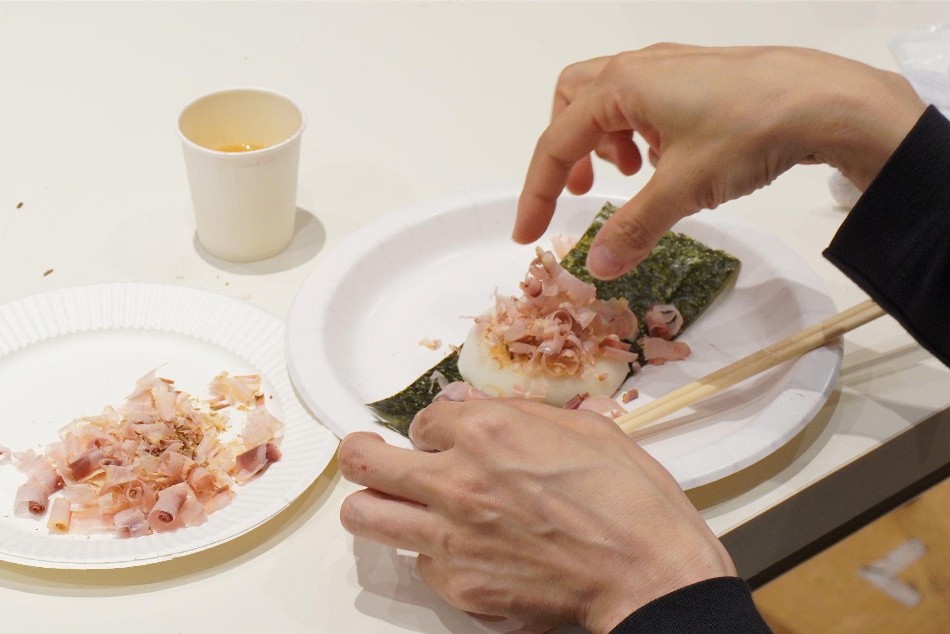 本イベントでは、ごま油をひいて軽く焼いた餅に、焼きたて海苔を添えてご提供しました。さらに今回は特別に、ご参加の皆様に本枯鰹節を削っていただき、焼きたて日本橋餅と削りたてのかつお節を一緒にお楽しみいただきました。