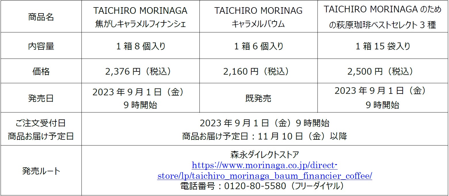 本年4月に森永ダイレクトストア限定で発売された「キャラメルバウム」は事前の販売計画比約300%と好調な実績でした。今回は、「TAICHIRO MORINAGA」第2弾として、「焦がしキャラメルフィナンシェ」を新発売いたします。創業者森永太一郎が、創業当時から製造してきた「キャラメル」の新たなおいしさを求めてたどり着いたのが、「焦がしキャラメル」。絶妙な火加減により、キャラメルの旨味を最大限に引き出し、コク深い味わいに仕立てました。また、前回ご好評いただいた「キャラメルバウム」も再発売いたします。