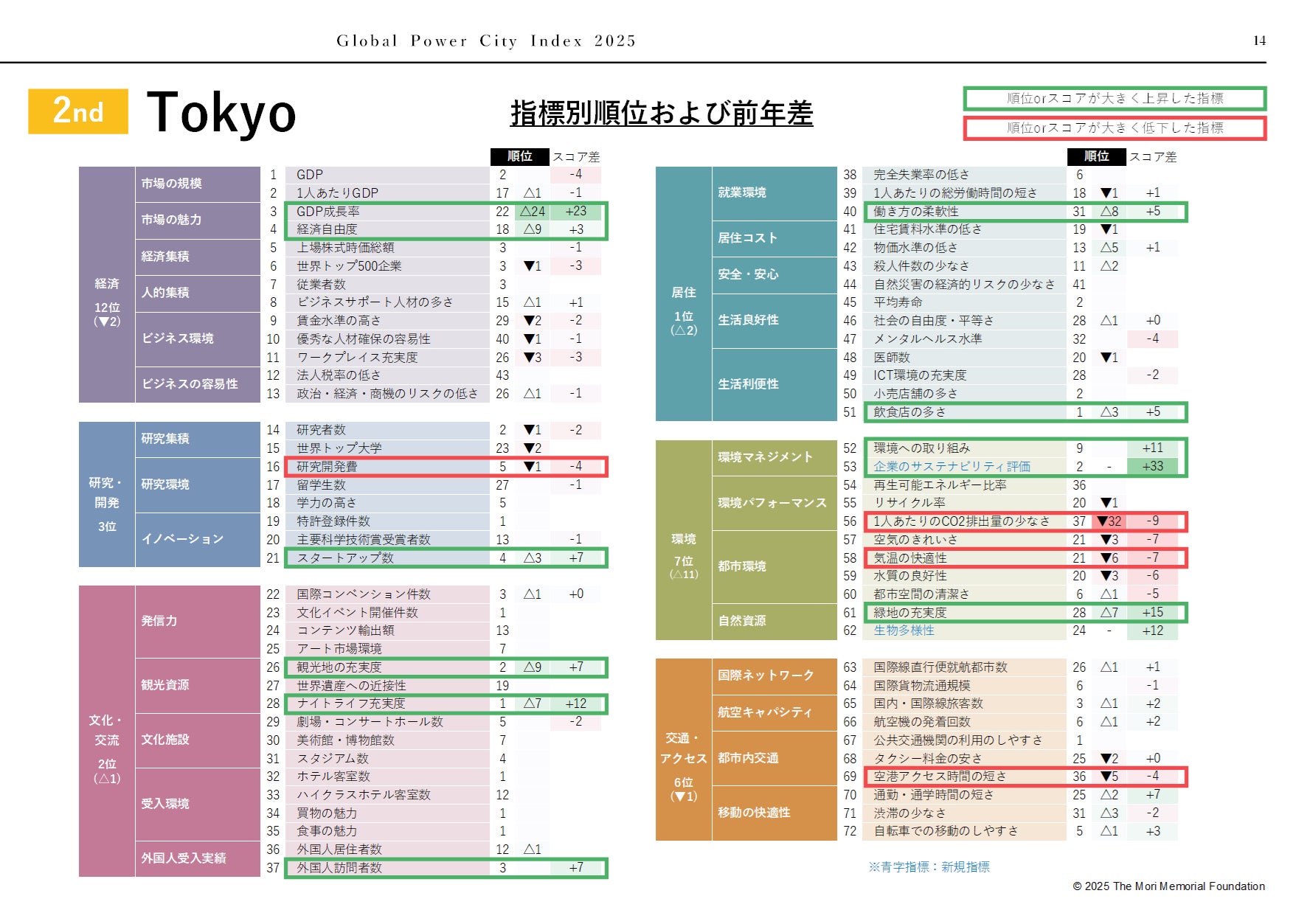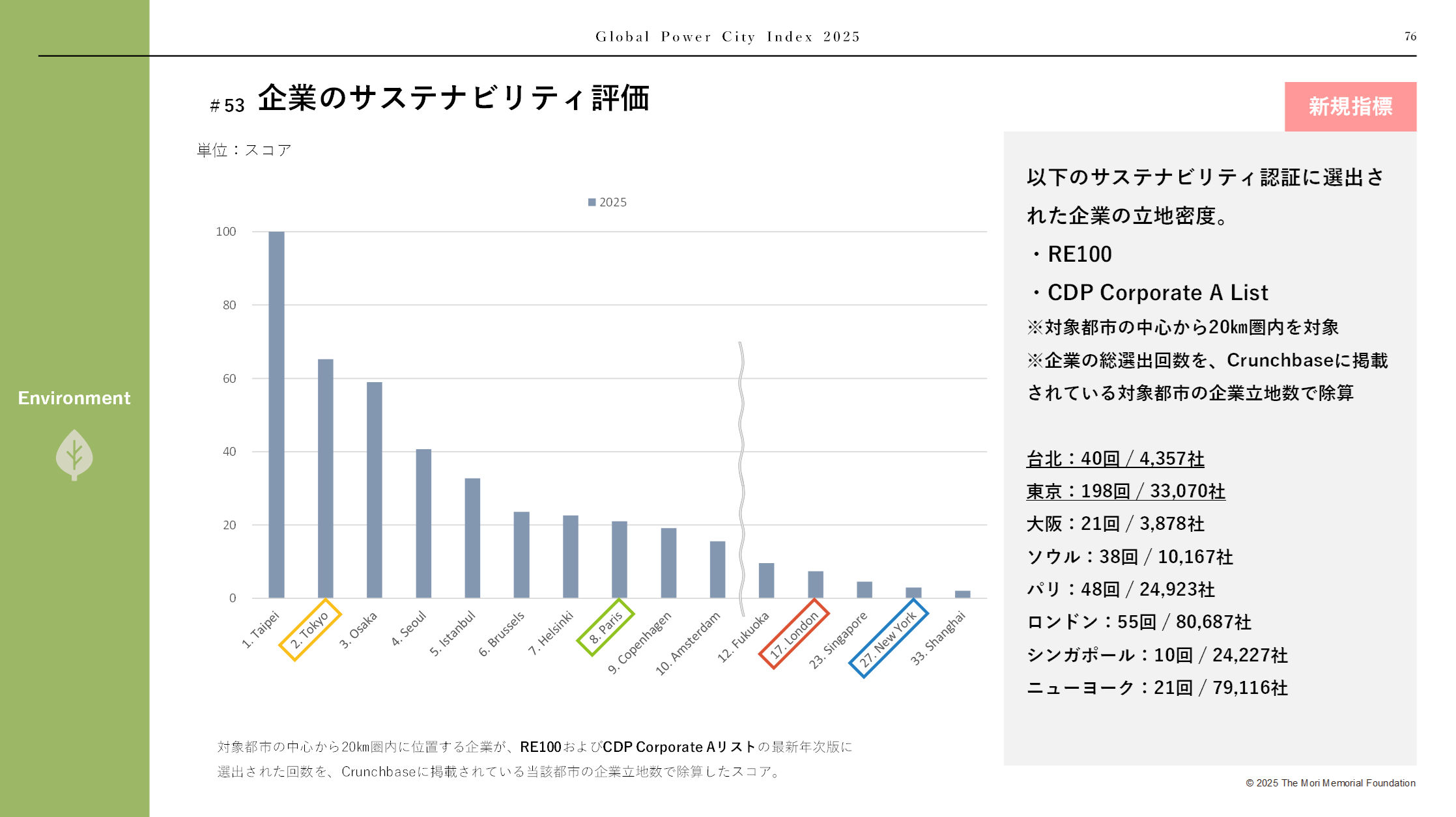 このほか、スタートアップの増加も評価されました。また、企業のサステナビリティ評価や生物多様性といった新しい指標も加わり、環境面での評価も上昇しています。