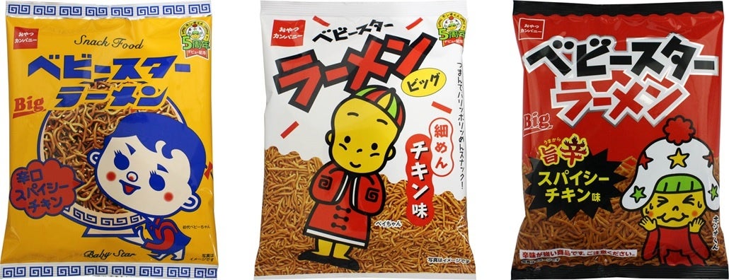 1959年の発売以来、60年以上に渡り愛され続けてきたベビースター。そんなベビースターのキャラクターとして商品パッケージで活躍してきた歴代のキャラクターたちが、3代目キャラクター・ホシオくんのデビュー5周年記念商品として帰ってきました!