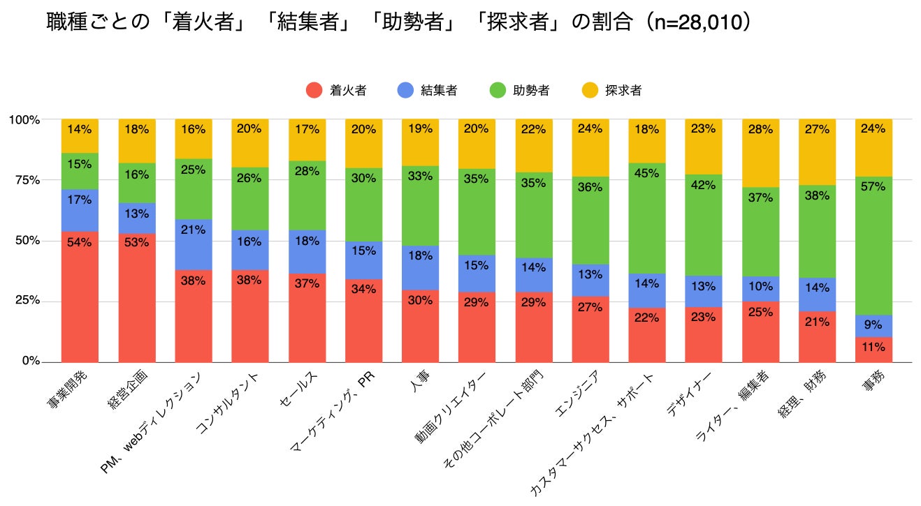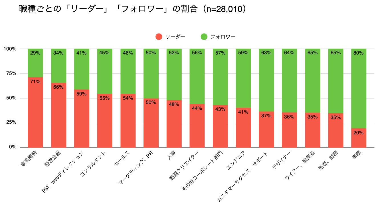 職種別では、事業計画の策定や、新規事業の開発など、組織をリードする場面の多い「事業開発」が最もリーダータイプの割合が多く、次いで「経営企画」「PM(プロダクトマネジャー)、webディレクション」が多いことを確認しました。フォロワータイプは、組織をサポートする機会が多い「事務」が最も多く、次いで「経理、財務」「ライター、編集者」が続く結果となりました。