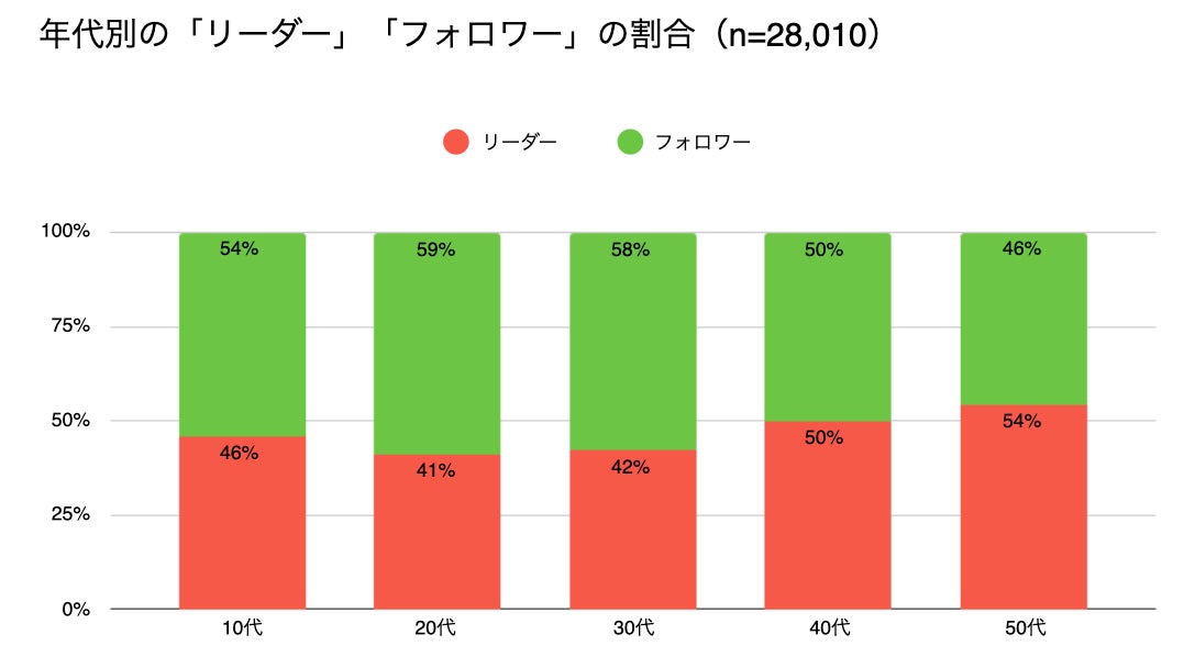 年代別では、10〜30代まではフォロワーの割合が多く、40代を境にリーダーとフォロワーの割合が逆転する結果となりました。背景としては、30代から徐々にマネジメント経験をされる方が増えはじめ、40代以降はマネージャーとして活躍される方が多くなることが関係していると考えられます。