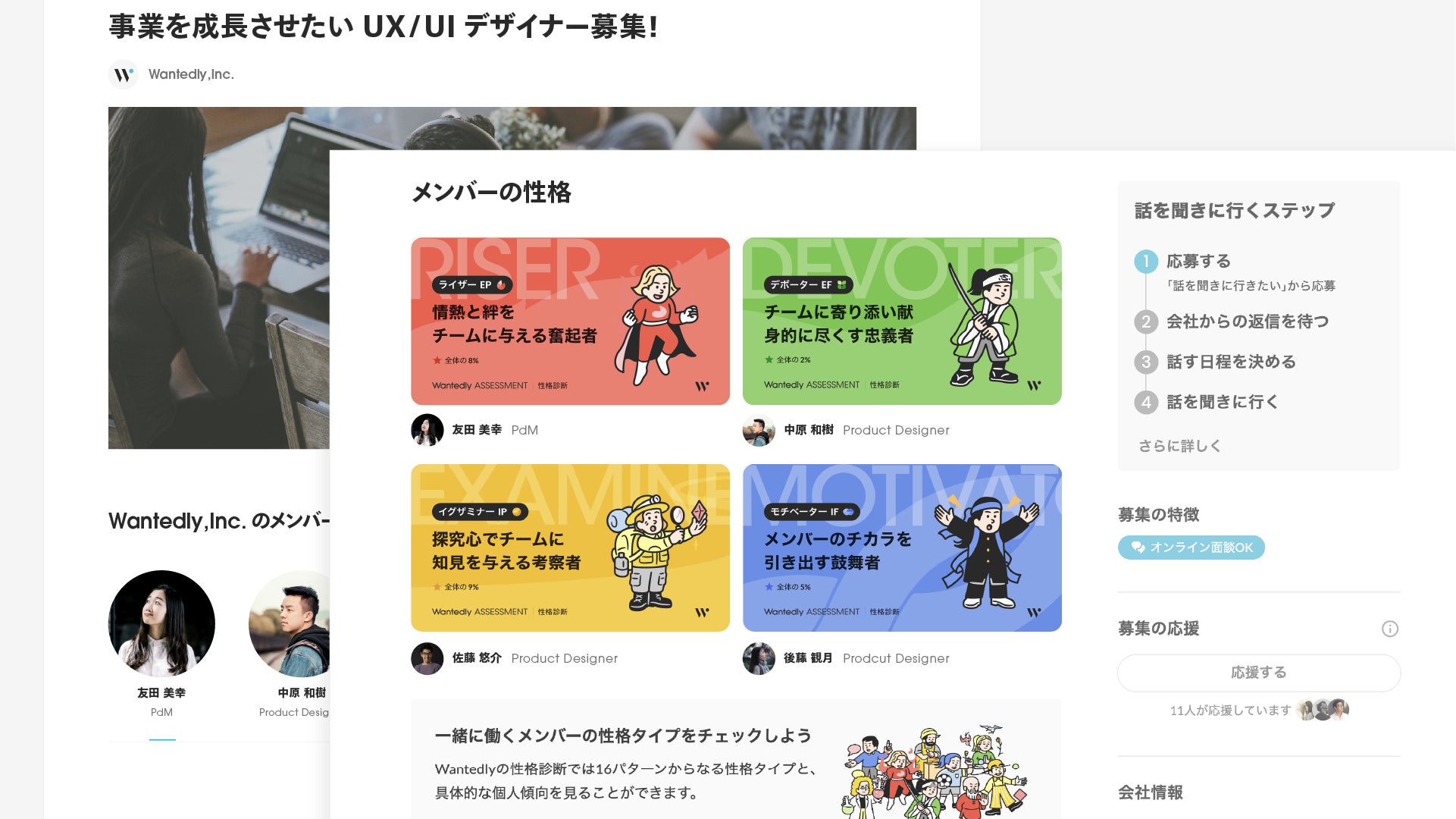 Wantedlyの募集ページに紐づいている、メンバーの性格がわかる機能を追加しました。チームの雰囲気を理解したり、ご自身がそのチームに加わった場合の活躍をイメージしやすくなっています。なお、同機能は、現在はブラウザ版のみ対応しています。