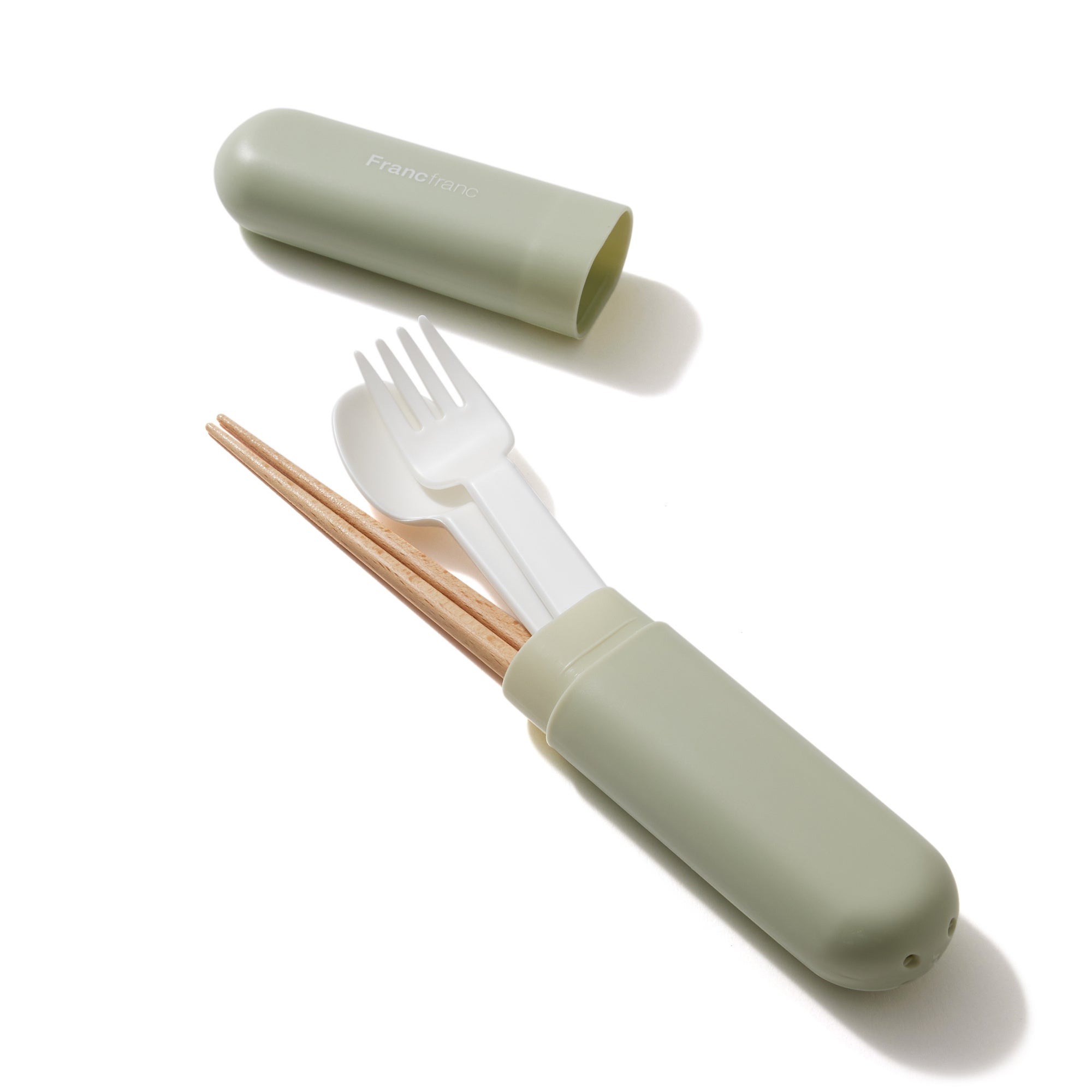 箸、スプーン、フォークがセットになった、軽くて持ち運びしやすいカトラリーセットです。