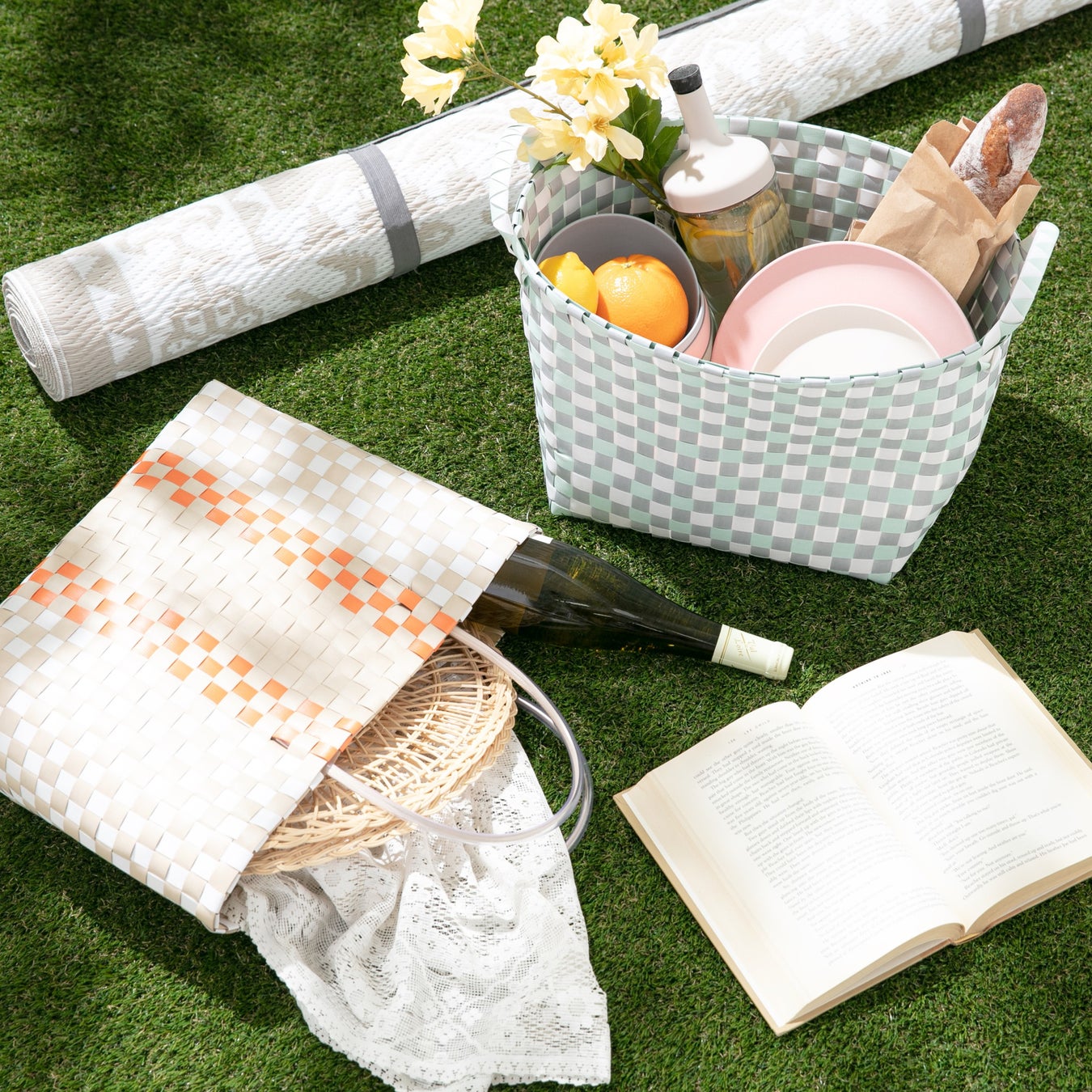 PPテープを編み込んだカジュアルなバスケットです。ピクニックにもお部屋のインテリアバスケットとしてもおすすめ。汚れが付きにくく、水にも強いため手入れがしやすいアイテムです。