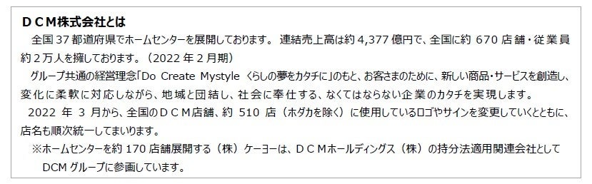 全国でホームセンター事業を展開するDCM 株式会社 (本社:東京都品川区、代表取締役社長:石黒靖規)は、連結子会社であるDCMニコット株式会社(本社:北海道札幌市、代表取締役社長:上田常世)が運営するホームコンビニ「DCMニコット 浄法寺店」岩手県二戸市を 、8月11日(木)に新規オープンします。DCMニコット 浄法寺店は店名を「DCMニコット」とした第一号店で、今後、その他の店舗の名称も「ホーマックニコット」から「DCMニコット」に変更する予定です。