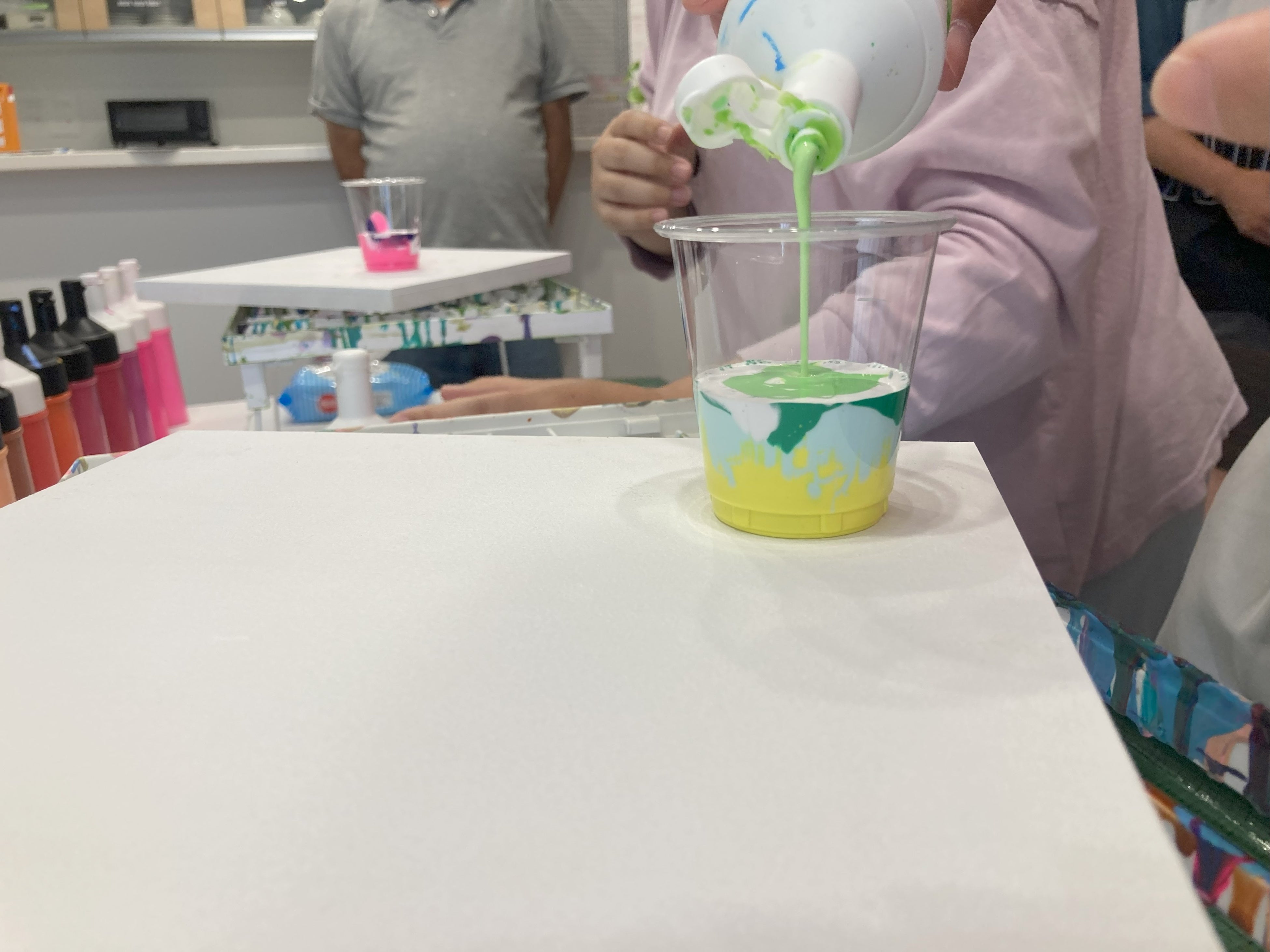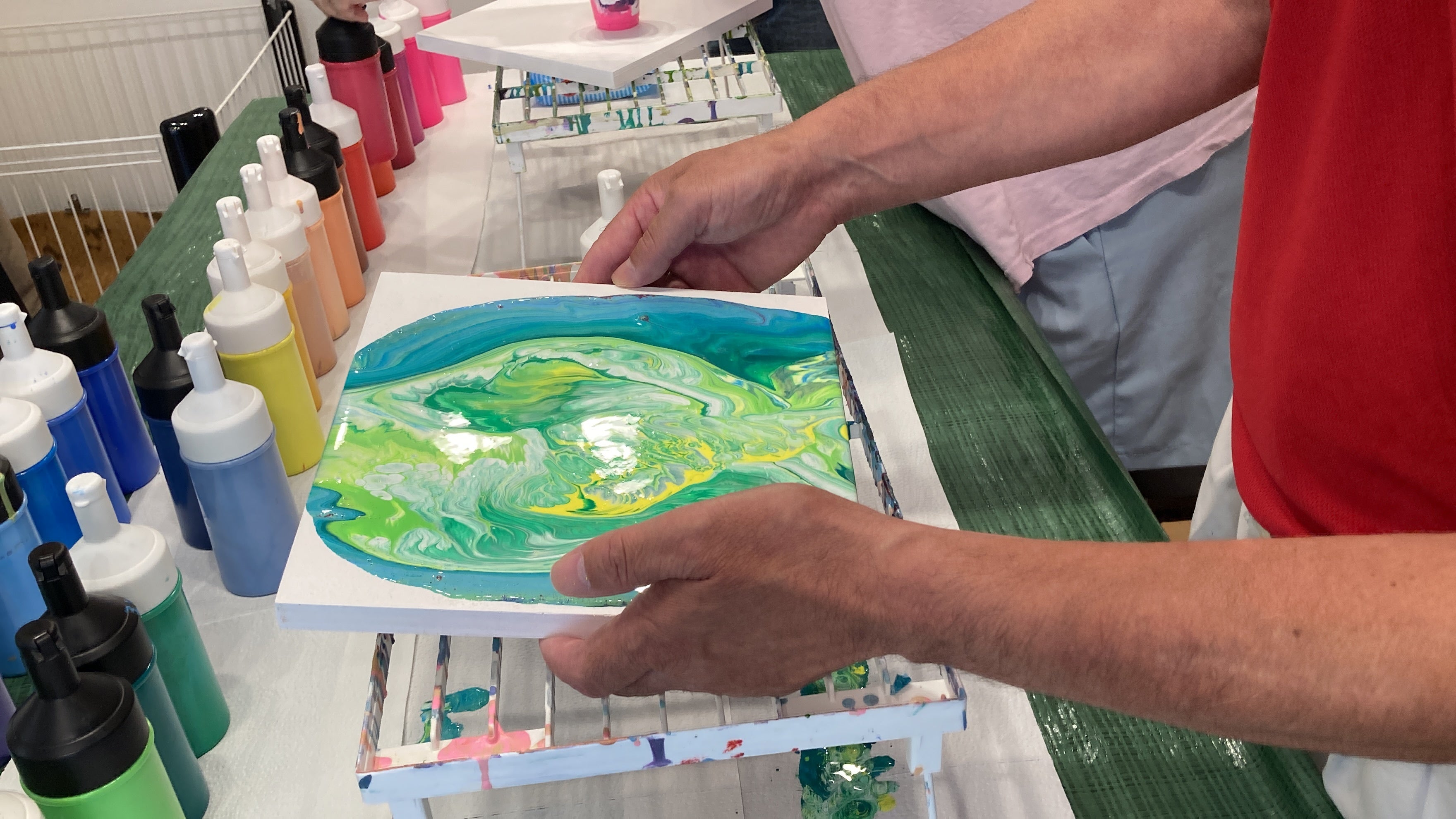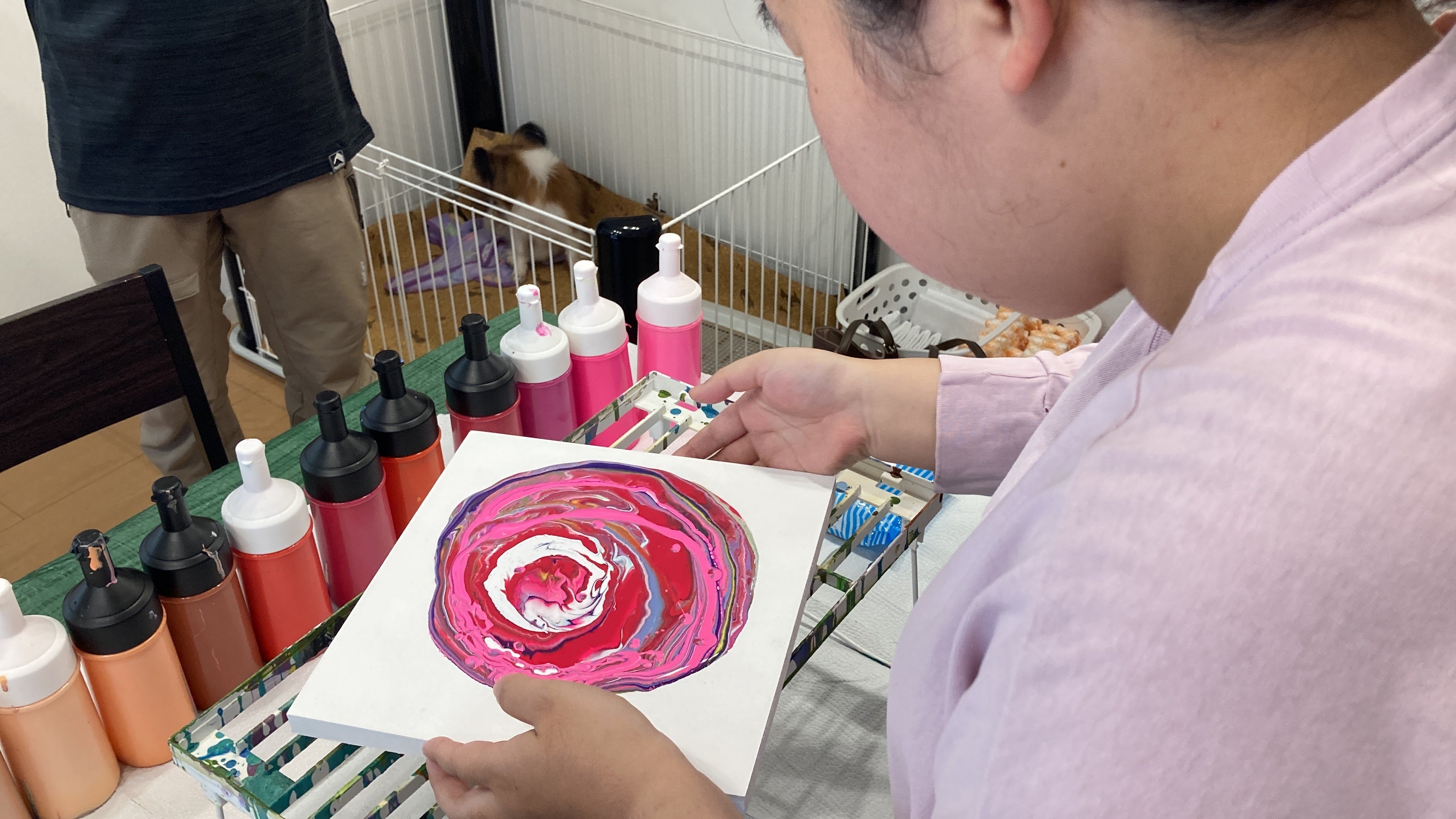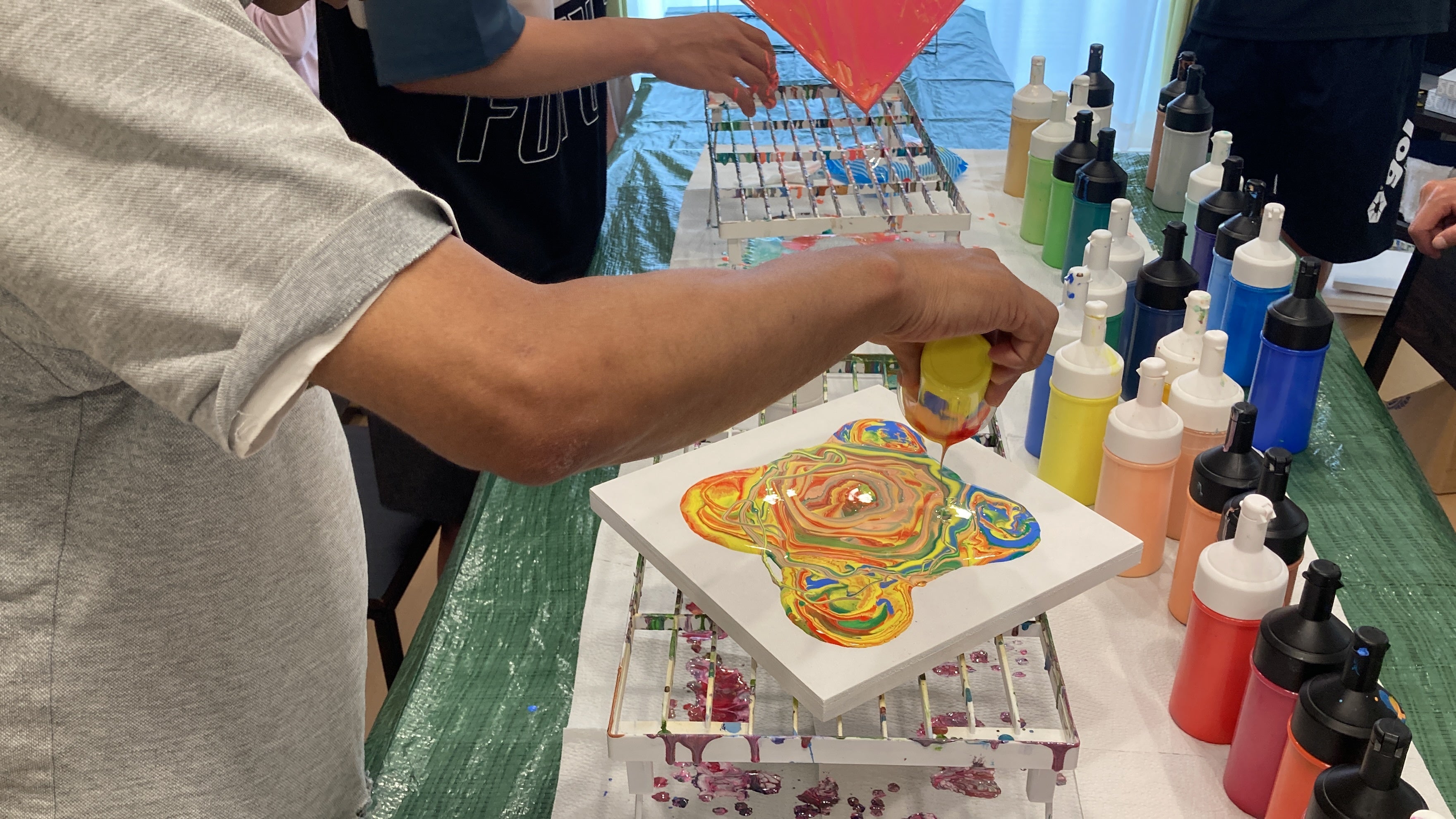 数種類のアクリル絵の具をキャンバスに垂らし、流動性を生かして描く技法。キャンバスを傾けたり、手で絵の具を広げたりして、作品を仕上げます。