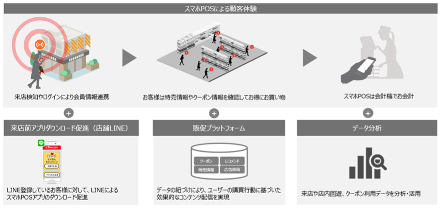 本実証実験では、両サービスの連携により、来店中および来店前後の消費者接点にて商品訴求力を高めるとともに、横断的に運用管理・データ分析することで販促業務のDX化を推進します。スマホ型POSレジアプリの利用促進を図り、スマホ型POSレジアプリを中心にした販促コンテンツ配信の効果およびメディア価値を検証します。また、各種検証データを横断的に分析することで、消費者の満足度向上や店舗業務の効率化への寄与についても検証します。
