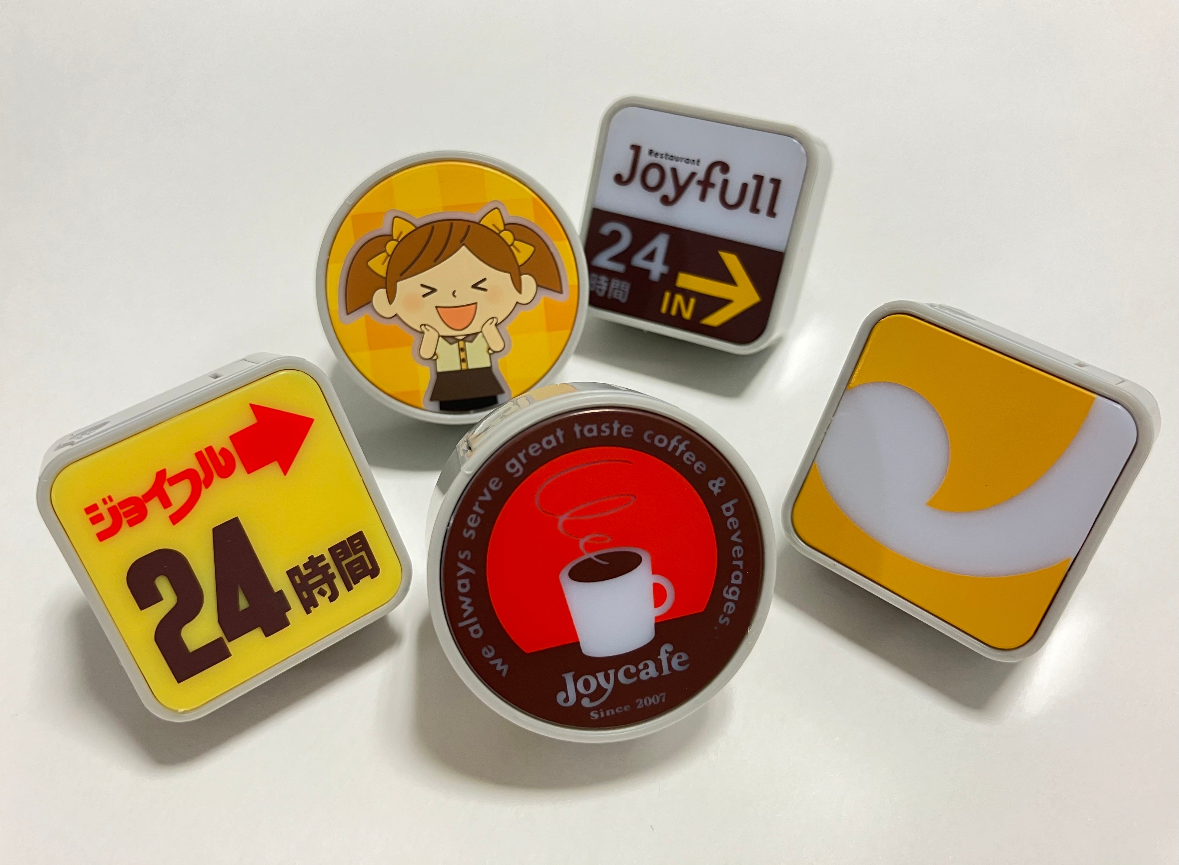 本商品はジョイフル店舗の看板をそのまま再現した3種と、ジョイフルのロゴと公式キャラクター「ジョイちゃん」をあしらった2種を約30mm~35mmのリングに再現したものです。
