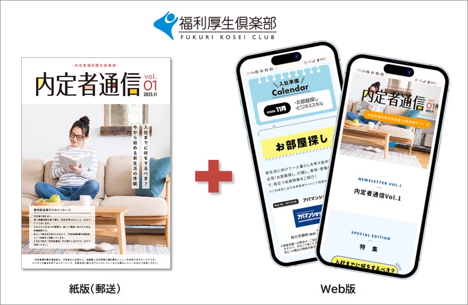 リログループ<東証プライム市場 8876>の一員であり、福利厚生アウトソーシングサービスのトップカンパニーである株式会社リロクラブ(本社:東京都新宿区、代表取締役社長 岡本 盛 https://www.reloclub.jp/ )が運営する「福利厚生倶楽部」では、入会企業の内定者向け無料サービス「内定者福利厚生倶楽部2025」において、毎年11月から翌3月まで内定者のご自宅に郵送*1 している『内定者通信』を2025年度よりWeb化し、スマートフォンやタブレット、PCから直感的に操作でき利用しやすいデザインにいたしましたことをお知らせいたします。