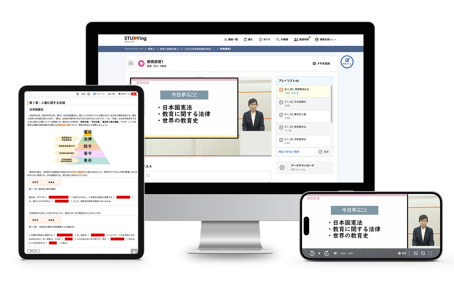 スタディングの保育士講座では、受験生が悩みがちとなる「学習方法の悩み」を解決し、合格に辿り着くための解法を習得することができます。