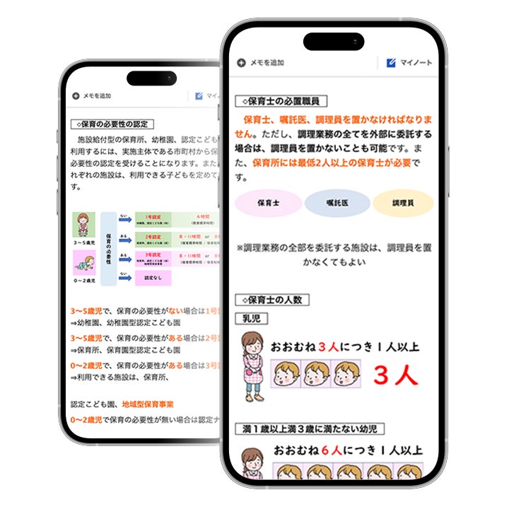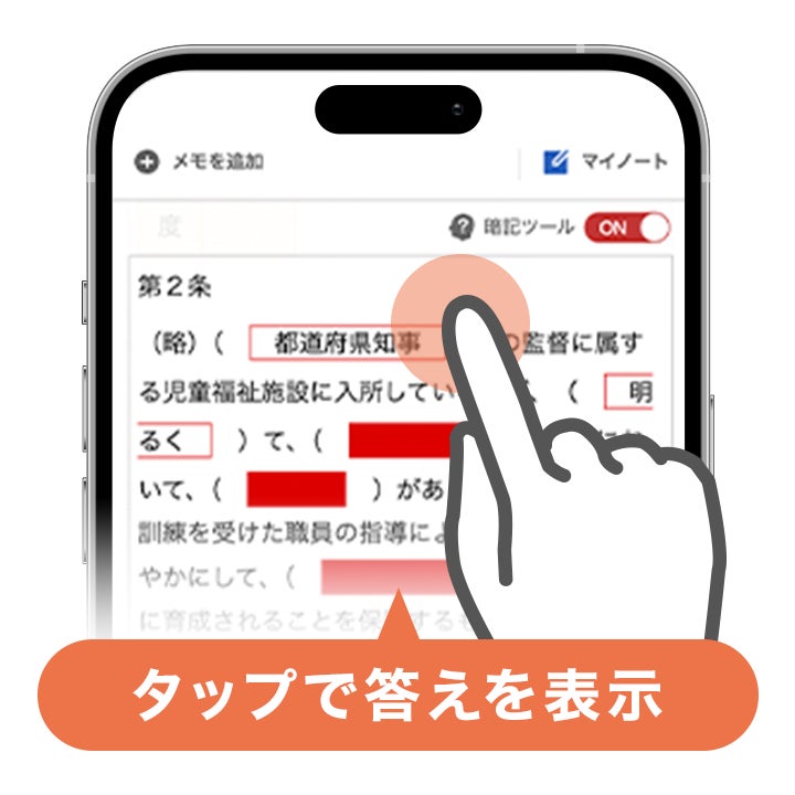初めて保育士試験に挑戦される方でも、専門用語の内容や関係性を理解しやすいように、テキストや動画講義には、図解での説明を多く採用しました。文章で読んでも分かりにくい専門用語や複雑なロジックも、「図表やイラストを駆使したスライド」を用いて視覚的に学習していただくことで、テレビの情報番組を見るように分かりやすく楽しく学習できます。さらに、試験で頻出の範囲は「暗記ツール」を使用し穴埋め形式で覚えられるので、タップしながらゲーム感覚で学習を進めることができます。