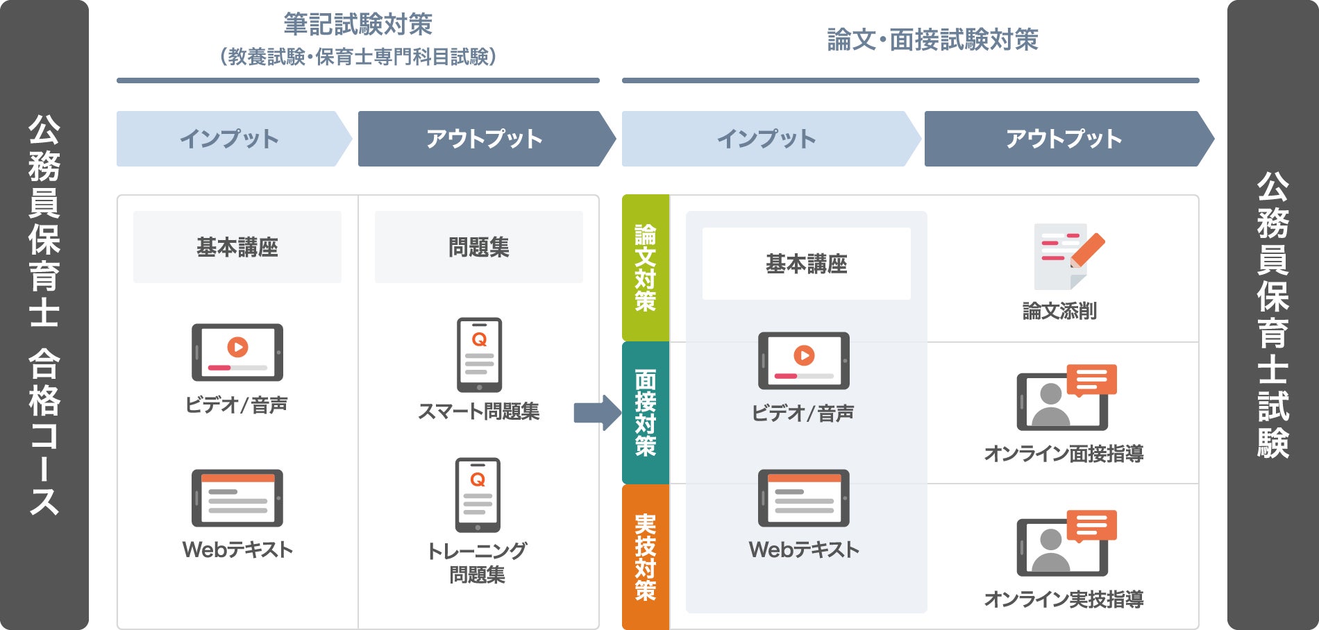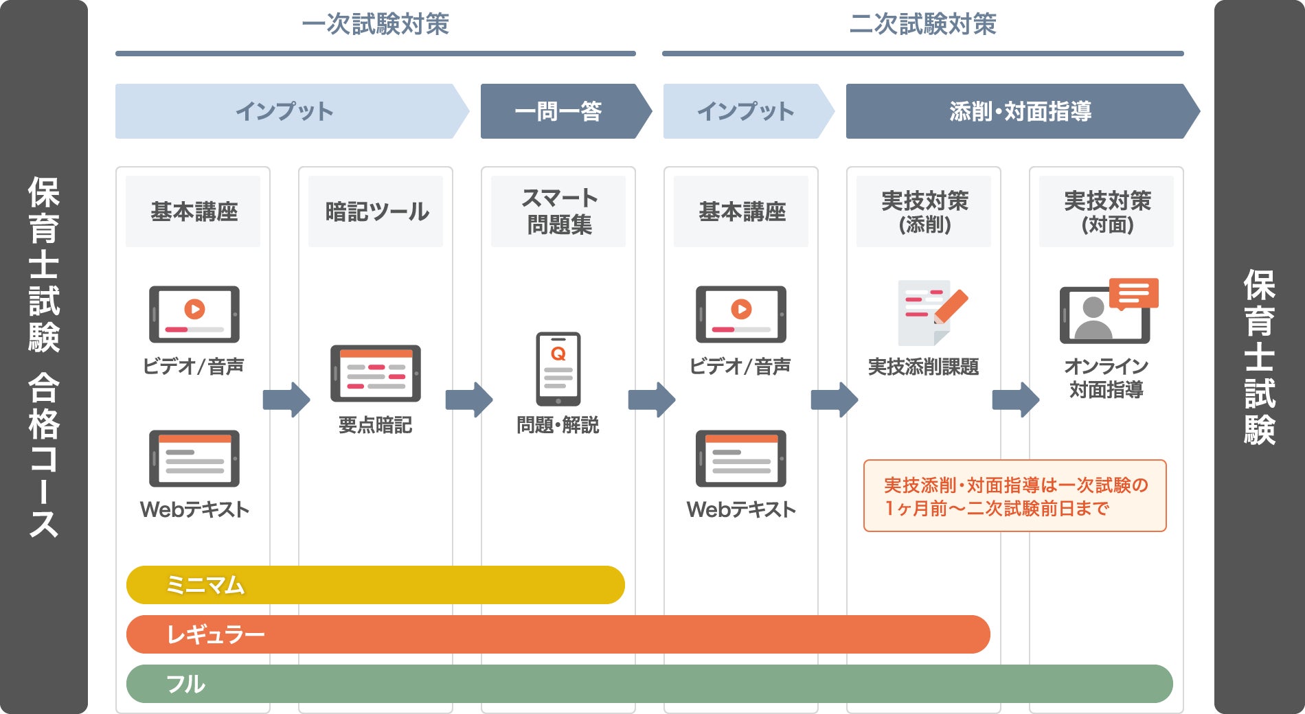 保育士講座では、一次試験対策のみならず、二次試験までオールインワンのコースをご用意。「実技試験にどのように臨めばよいかわからない」という方も、講師とともに二人三脚で試験対策できます。受講者がアウトプットしたものを画像や映像で提出しテキストベースでフィードバックをもらえる無制限添削がついてくるレギュラーコースと、講師とオンラインでつなぎその場で指導を受けられる無制限対面指導がついてくるフルコースを展開。
