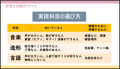 筆記試験を合格したら、実技試験である二次試験に進みます。二次試験では、「音楽表現」「造形表現」「言語表現」の3つの分野から2分野を選択し受験します。どの2分野を選ぶかにより合格のしやすさも変わってきますので、科目を選択する際のポイントや基準をお伝えし、それぞれどのように対策すべきかを丁寧にレクチャーします。
